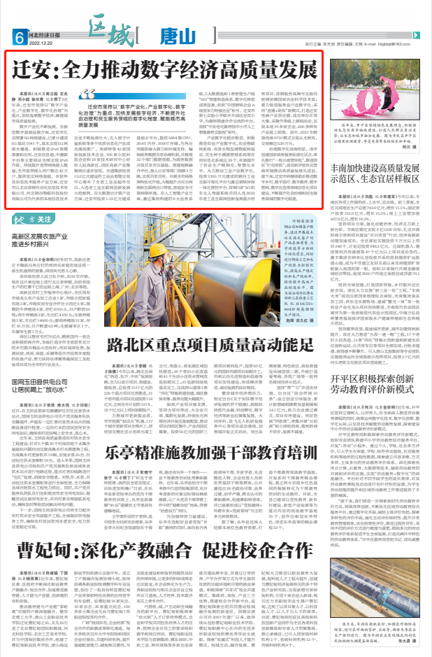 本报讯(通讯员商立超 玄兆静 邓小超 耿长青 记者邢丁)近年来,迁安市坚持以“数字产业化、产业数字化、数字化治理”为重点,加快发展数字经济,赋能城市高质量发展。