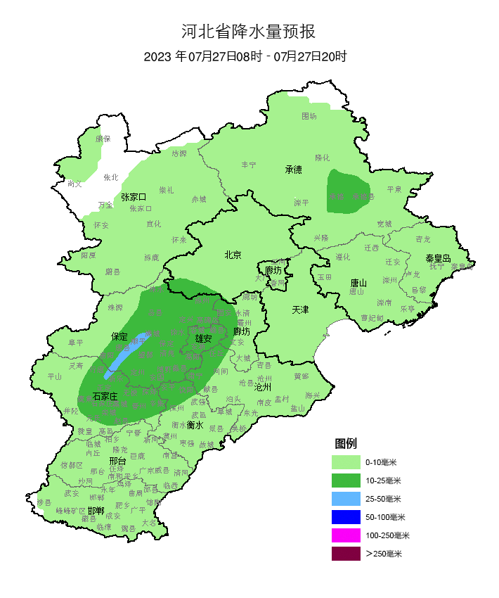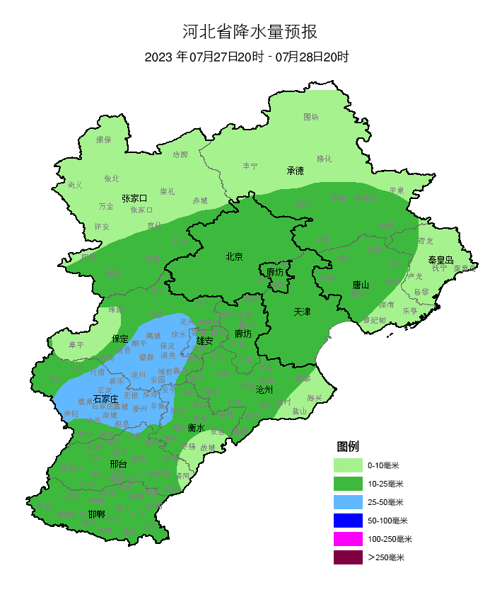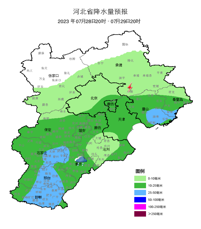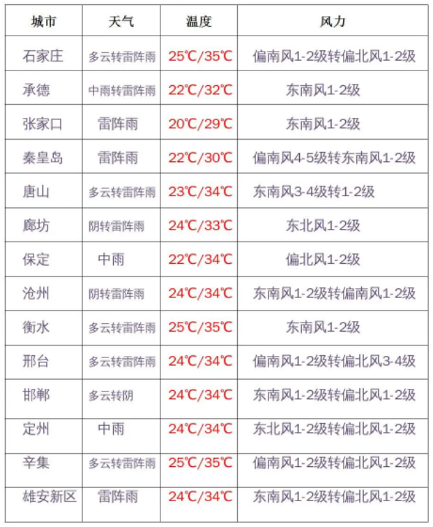 今天夜间到28日,全省多云间阴,大部分地区有分散性雷阵雨或阵雨,其中张家口南部、承德南部、保定、雄安新区、廊坊、石家庄局地有中到大雨,个别地点有暴雨。