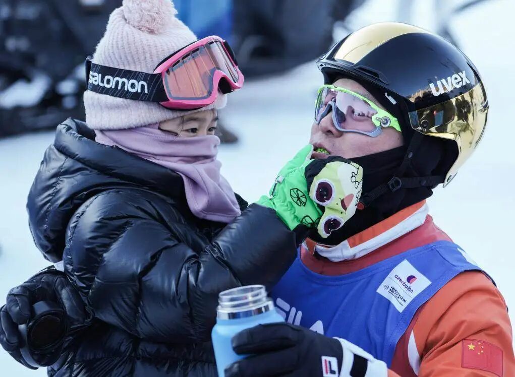 12月20日,中国自由式滑雪运动员齐广璞(右)的女儿在赛后为他摘下护脸。新华社记者 卢星吉 摄