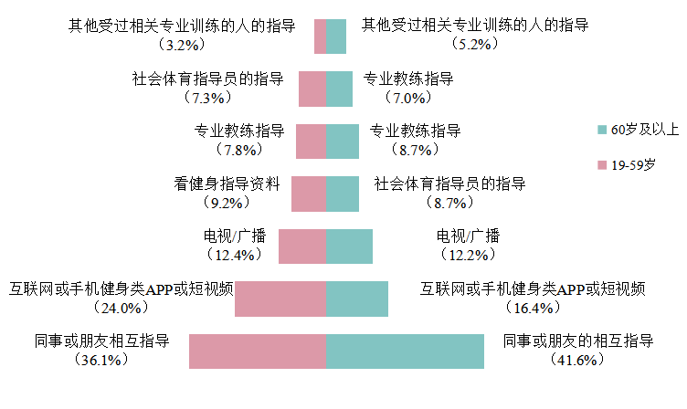 获得过体育健身指导的成年人与老年人比例分别为41.6%和38.9%。其中,成年人获得体育健身指导的主要途径是“同事、朋友互相指导(36.1%)”和“互联网、手机健身类APP、短视频等(24.0%)”。老年人获得体育健身指导的主要途径是“同事、朋友相互指导(41.6%)”“互联网、手机健身类APP、短视频等(16.4%)”和“电视(DVD/录像)、广播(12.2%)”(图11)。