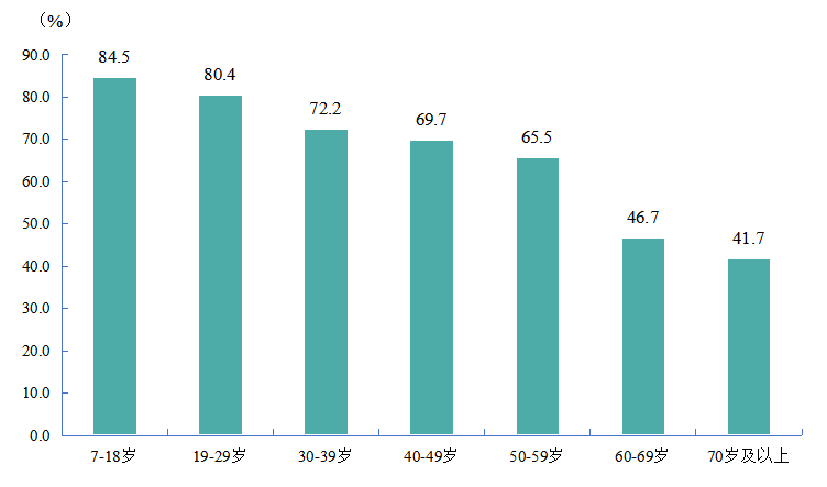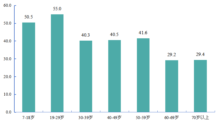 分人群分析,儿童青少年经常参加体育锻炼人数比例为50.5%;成年人经常参加体育锻炼人数比例为43.7%,其中19~29岁年龄组的比例最高,为55.0%;老年人经常参加体育锻炼人数比例为29.2%,到70岁以后,仍有29.4%的老年人经常参加体育锻炼(图2)