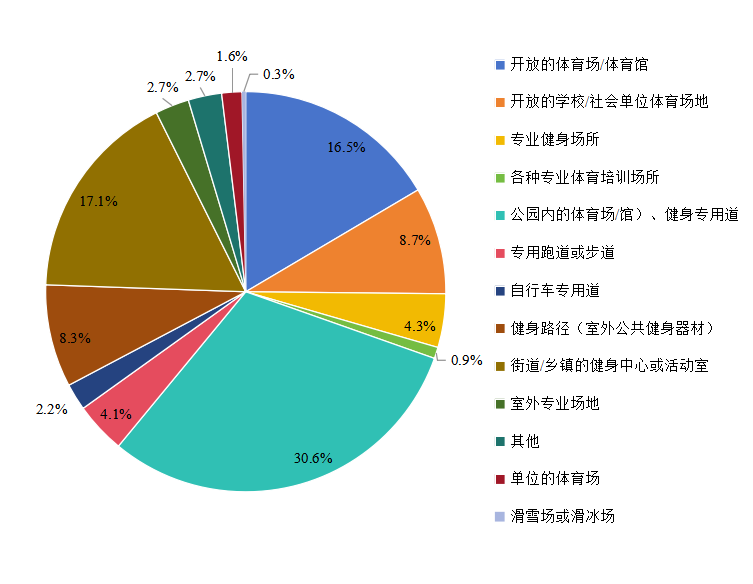 公共体育场地设施呈现政府主导、多元供给的利用格局,“公园内的体育场/馆、健身专用道”“街道/乡镇的健身中心或活动室”“开放的体育场/体育馆”“开放的学校/社会单位体育场地”“健身路径(室外公共健身器材)”“专业健身场所(如健身房、健身俱乐部)”等是成年人与老年人体育健身的主要场所,其中,使用政府兴建的公园内的体育场/馆、健身专用道和街道/乡镇的健身中心或活动室进行体育健身的比例分别为30.6%和17.1%(图8)。