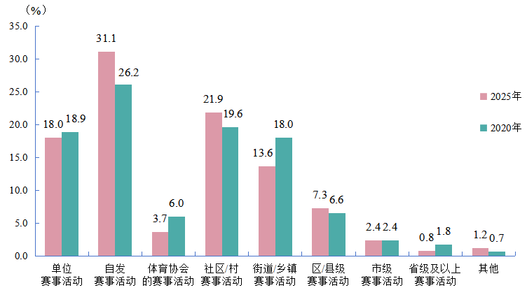 参加过群众体育赛事活动的比例为36.3%,与2020年调查相比,提升了11.2个百分点。其中“朋友、同事(同学)等自发组织的赛事活动(31.1%)”“社区(或村)举办的健身赛事活动(21.9%)”“单位组织的健身赛事活动(18.0%)”为主要形式,且朋友、同事(同学)等自发组织的赛事活动与2020年调查相比提高最多,提高4.9个百分点(图10),参加体育健身组织和赛事活动的“身边化”特征依然凸显。