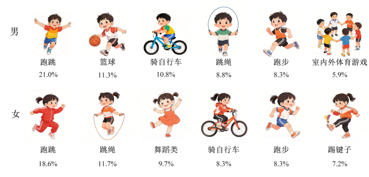 幼儿参加的体育活动项目主要是跑跳(19.8%)、跳绳(10.2%)、骑儿童自行车(9.6%)、篮球(9.5%)和跑步(8.3%)等,且存在性别差异,男性幼儿参加篮球和骑自行车的比例较高,女性幼儿参加跳绳和舞蹈类的比例较高(图3)。
