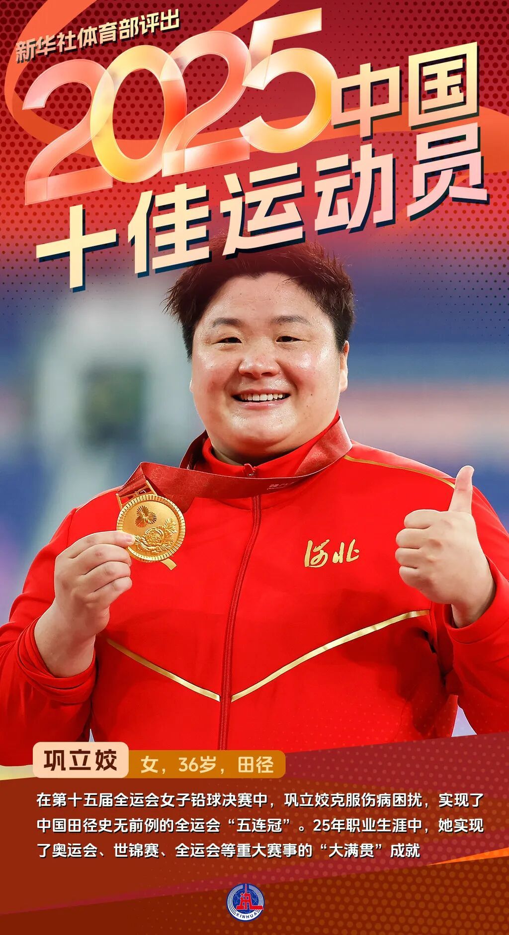 在新华社体育部发布的2025年中国十佳运动员名单中,河北运动员巩立姣、孙颖莎位列其中。今年36岁的巩立姣已多次入选该名单,新华社体育部对其2025年的年度评语为:“在第十五届全运会女子铅球决赛中,巩立姣克服伤病困扰,实现了中国田径史无前例的全运会‘五连冠’。25年职业生涯中,她实现了奥运会、世锦赛、全运会等重大赛事的‘大满贯’成就。”