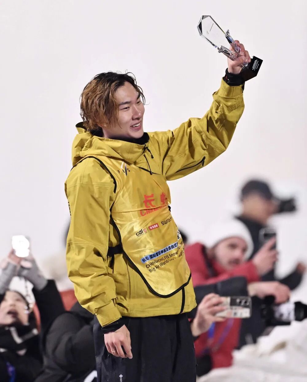 2025年12月6日,冠军中国选手苏翊鸣在2025-2026赛季国际雪联单板及自由式滑雪大跳台世界杯北京站单板滑雪大跳台男子组颁奖仪式后向观众致意。新华社记者 陶希夷 摄
