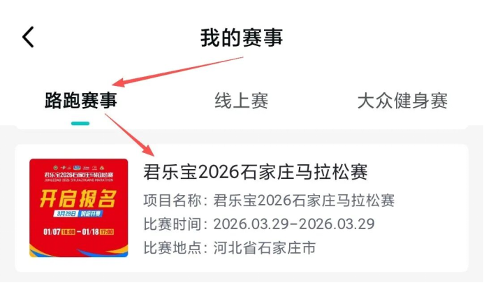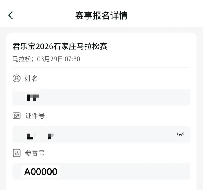 参赛号码与分区是选手参赛的核心凭证,直接关联检录入场、计时计分、成绩生效等全流程。本届石马仅开通数字心动App线上查询渠道,操作步骤简单易懂:跑友使用报名时预留的手机号登录数字心动App,依次进入“我的”—“我的赛事”—“路跑赛事”页面,选中“君乐宝2026石家庄马拉松赛”,即可一键查询个人分区安排与专属参赛号码。