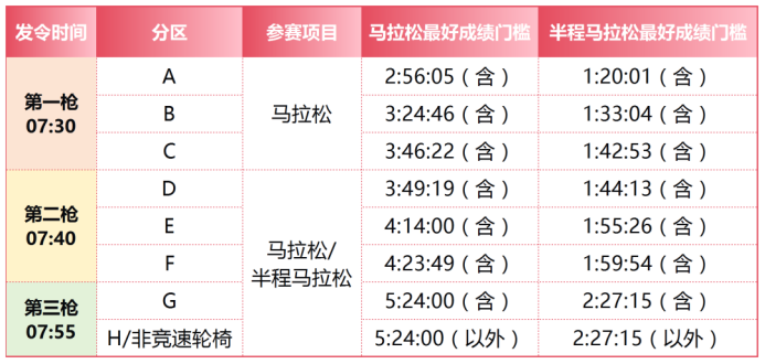 本届石家庄马拉松参赛规模达35000人,为优化起跑秩序、提升跑者体验,赛事采用“三枪八区”发令起跑模式,首枪发令时间定为3月29日7:30。参赛选手按成绩划分为A、B、C、D、E、F、G、H共8个集结区域,赛事当天选手需严格按照对应分区完成检录集结,各区间隔10米设置,避免人员拥挤。