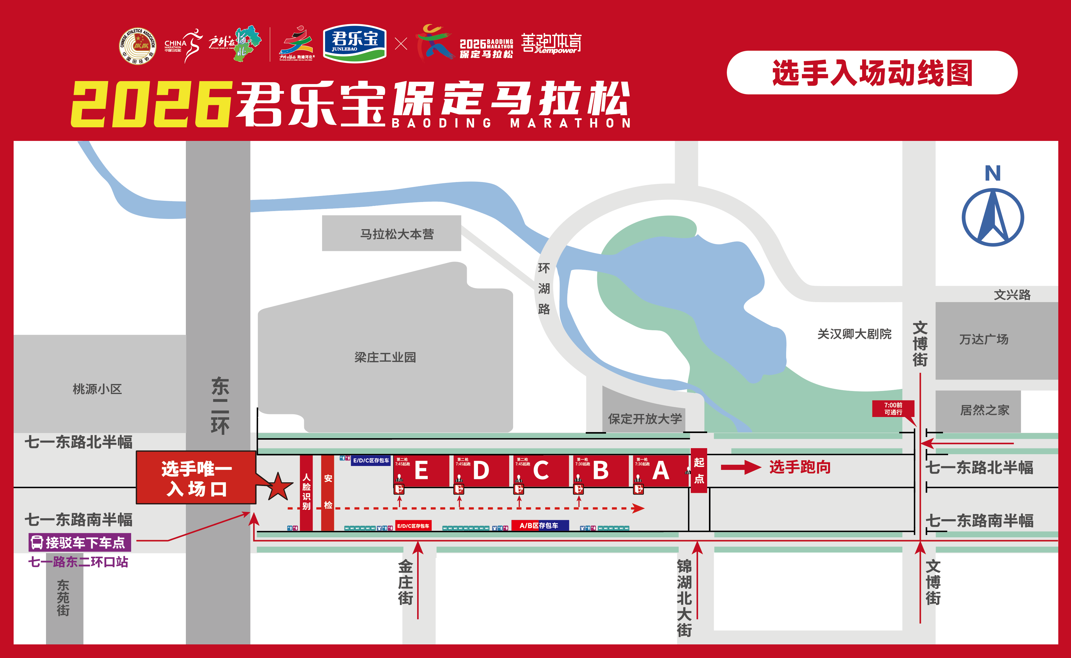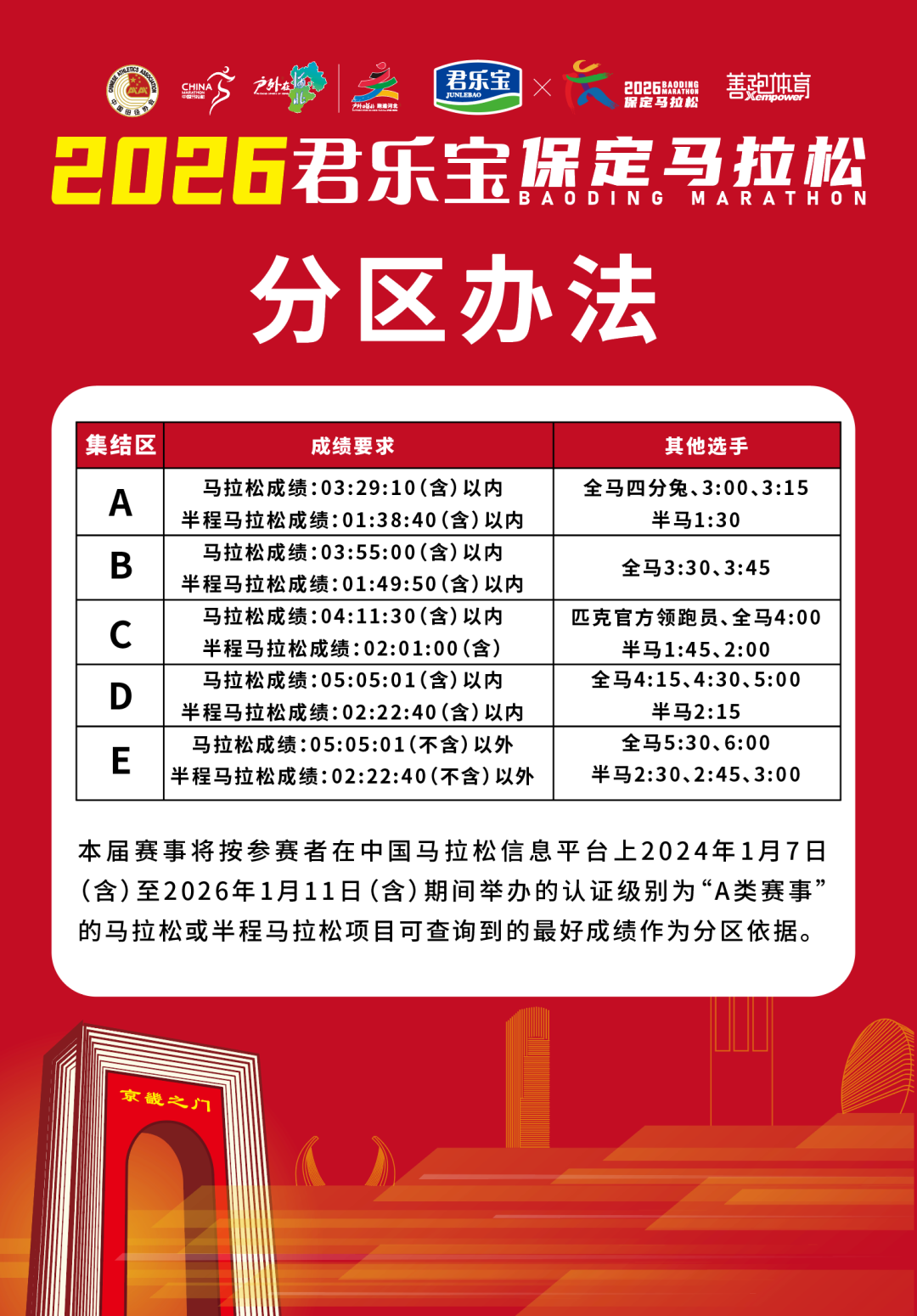 2026君乐宝保定马拉松采用“混合分区检录、分枪起跑”的起跑管理办法。设置A、B、C、D、E五个分区,均为马拉松和半程马拉松参赛者混合集结区。