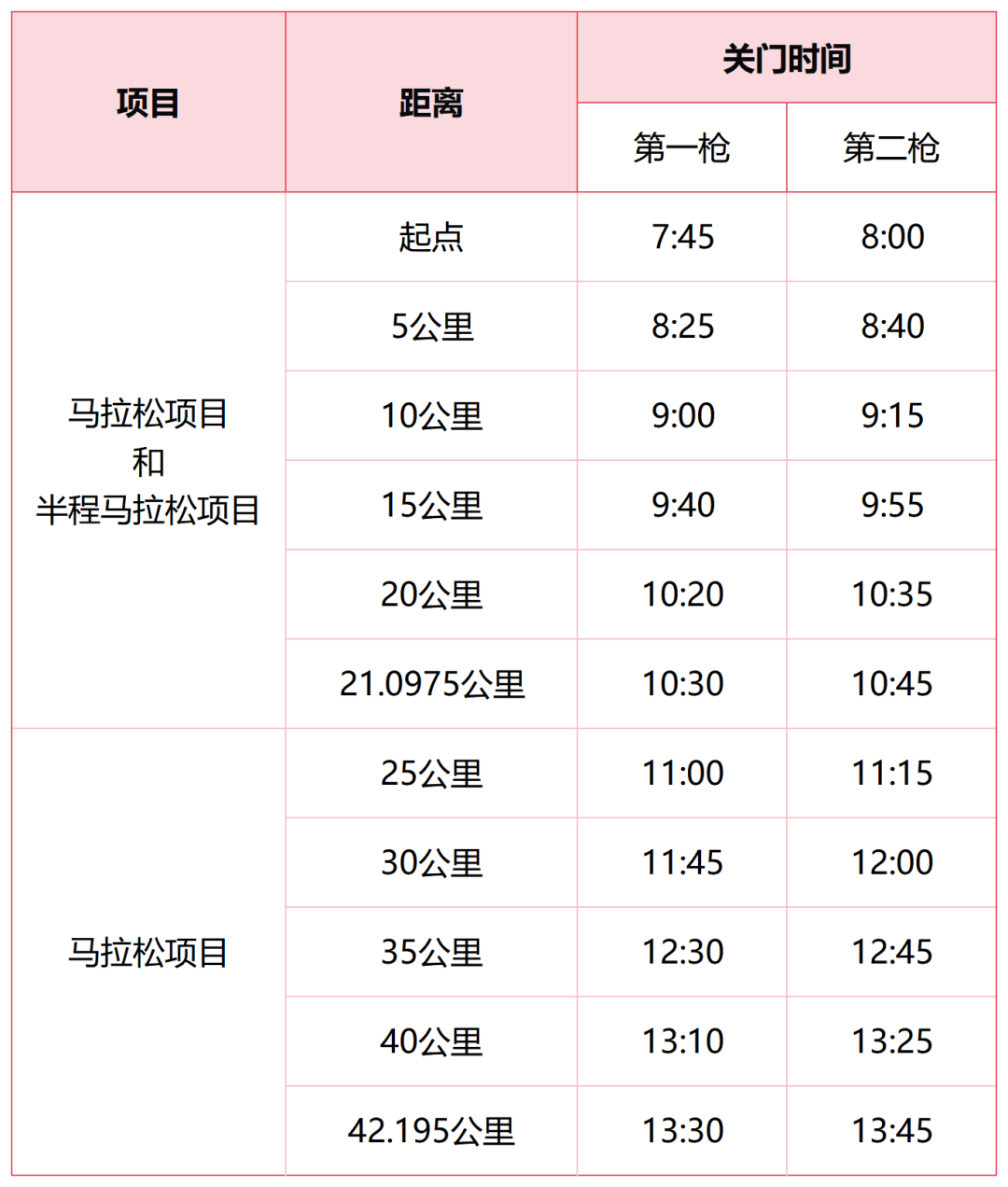 为了保证参赛者比赛安全,限时对社会交通进行滚动封闭。比赛路线各段专设了赛事关门时间,到了关门时间,相应公里点的计时毯停止工作,相应路段将恢复社会交通。