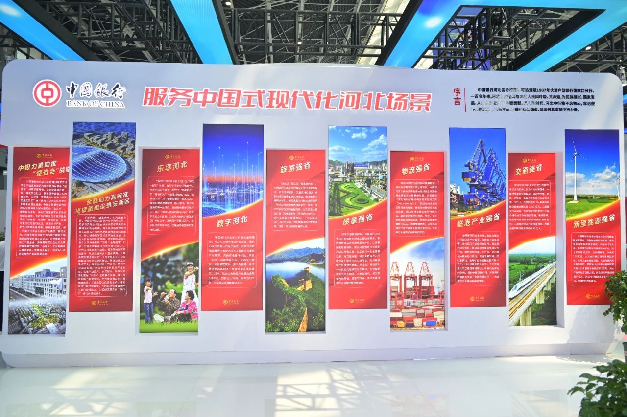 在“服务河北”板块,10幅立体展板生动展示了中国银行服务“中国式现代化河北场景”及服务雄安新区高标准高质量建设、助力“强省会”战略的丰硕成果。河北中行的历史最早可追溯至1907年大清户部银行张家口分行。一百多年来,河北中行始终坚持立足河北、服务河北,全面服务河北经济社会发展,为经济强省、美丽河北建设贡献中行力量。河北中行2022年绿色贷款增速列国有四大行首位,2023年授信增幅达23%;累计为全省交通基础设施建设投放贷款超2000亿元,信贷余额居商业银行首位。提供物流企业供应链贷款超30亿元,支持全省打造“三区一基地”。支持氢冶炼、钢铁企业退城搬迁等尖端项目,助力打造质量强省。支持河北智坤科技、张北数据港等项目以“金融活水”赋能“数字河北”。