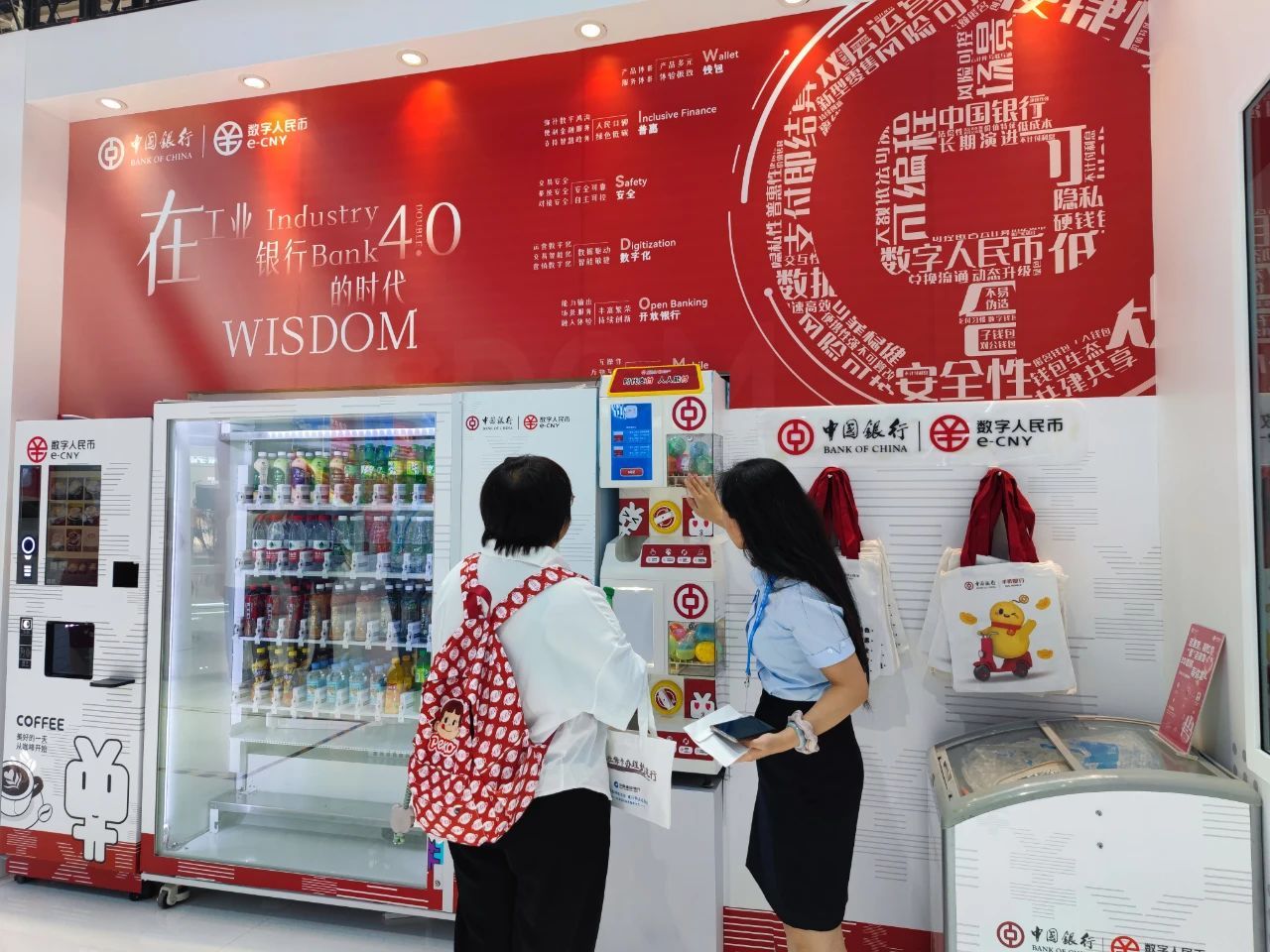在“数字人民币”专区,除了展示多样化的数字人民币硬钱包(可穿戴设备)和应用场景外,还为现场观众设置了咖啡机、扭蛋机等互动设备,观众通过扫码下载“数字人民币”APP,即可现场使用数字人民币结算。截至7月末,河北中行已拓展数币收款的商户超过 17万家,累计流通笔数达到258万笔、金额突破27 亿元,并发放数币贷款超2亿元。中国银行研发的复兴壹号党建平台,已提供给800家外部单位使用,并全面支持数字人民币缴费。