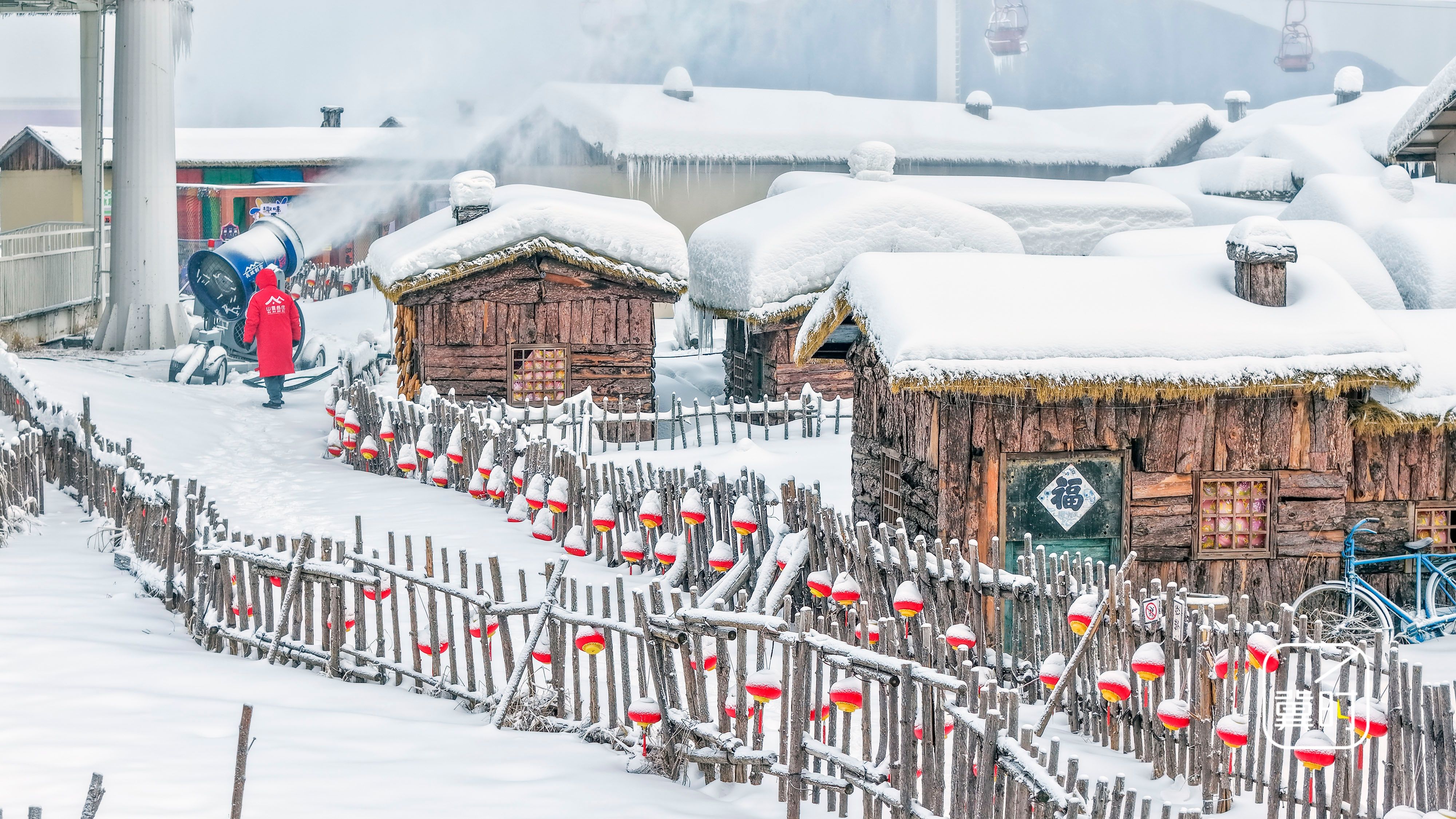 1月14日,工作人员在唐山遵化市团瓢庄镇山里各庄雪乡景区,做开园前的准备工作。