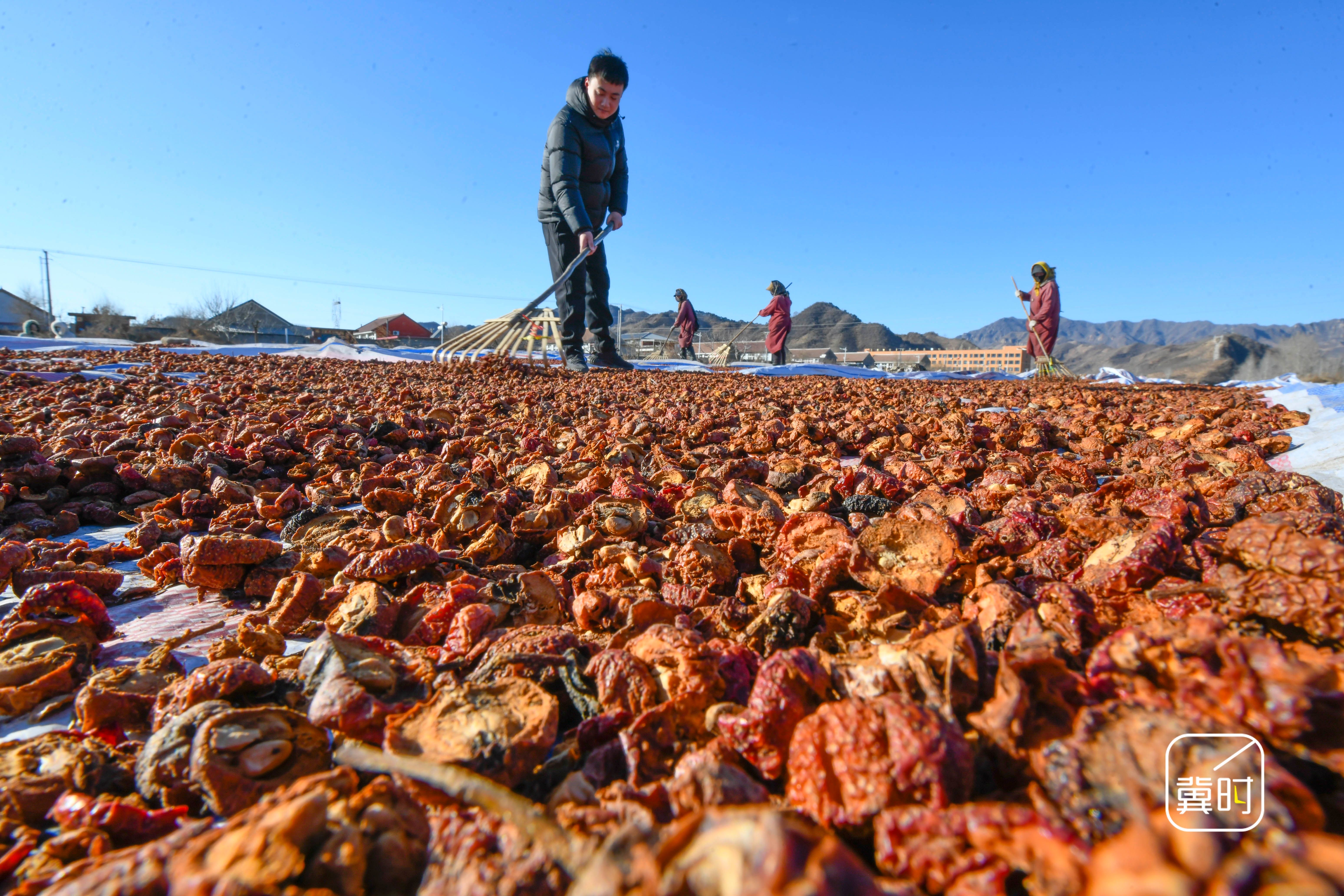 1月16日,承德市兴隆县蓝旗营镇古石村农民在晾晒山楂。