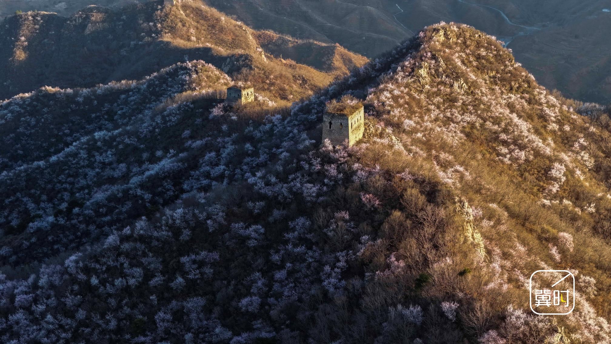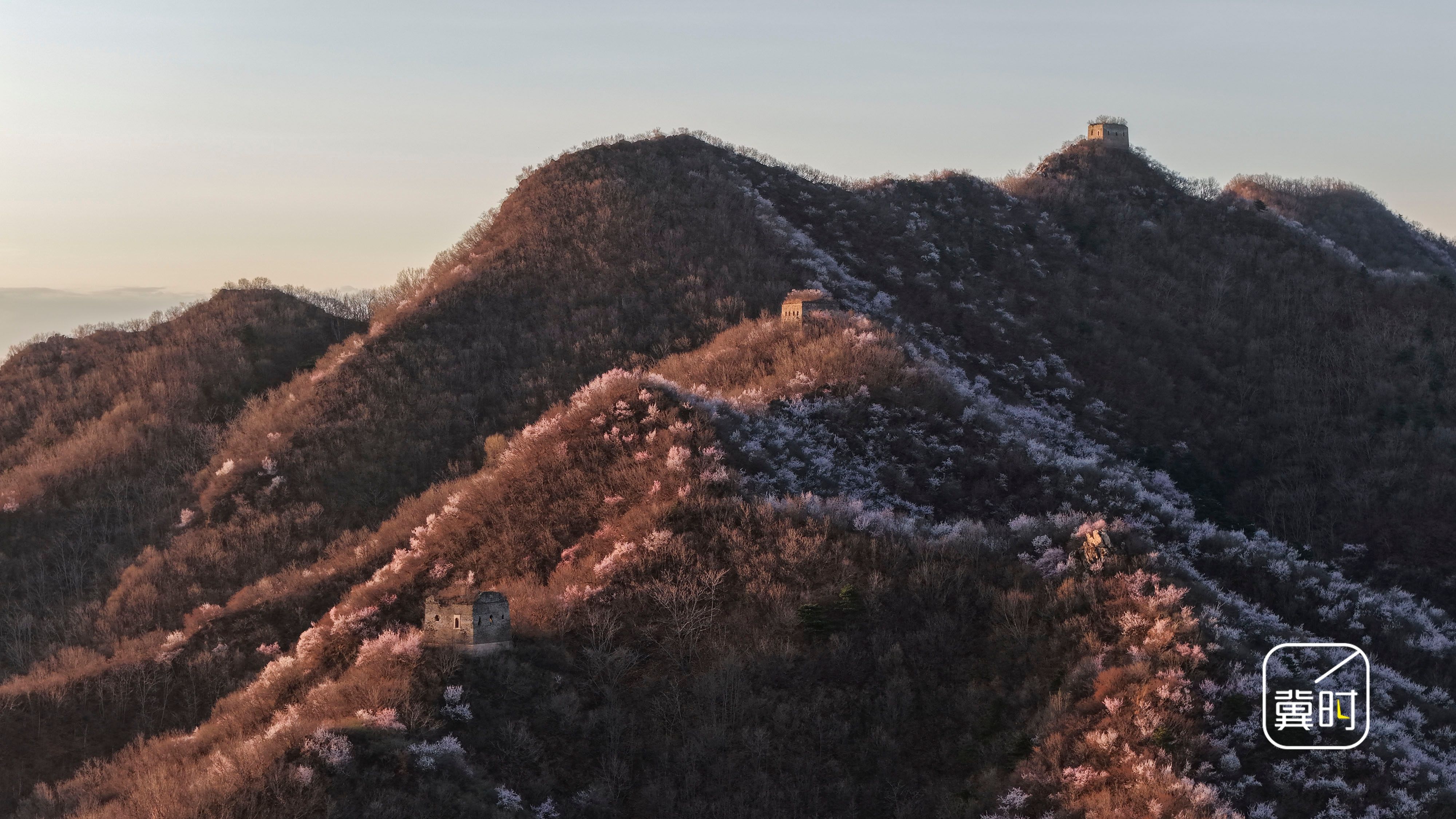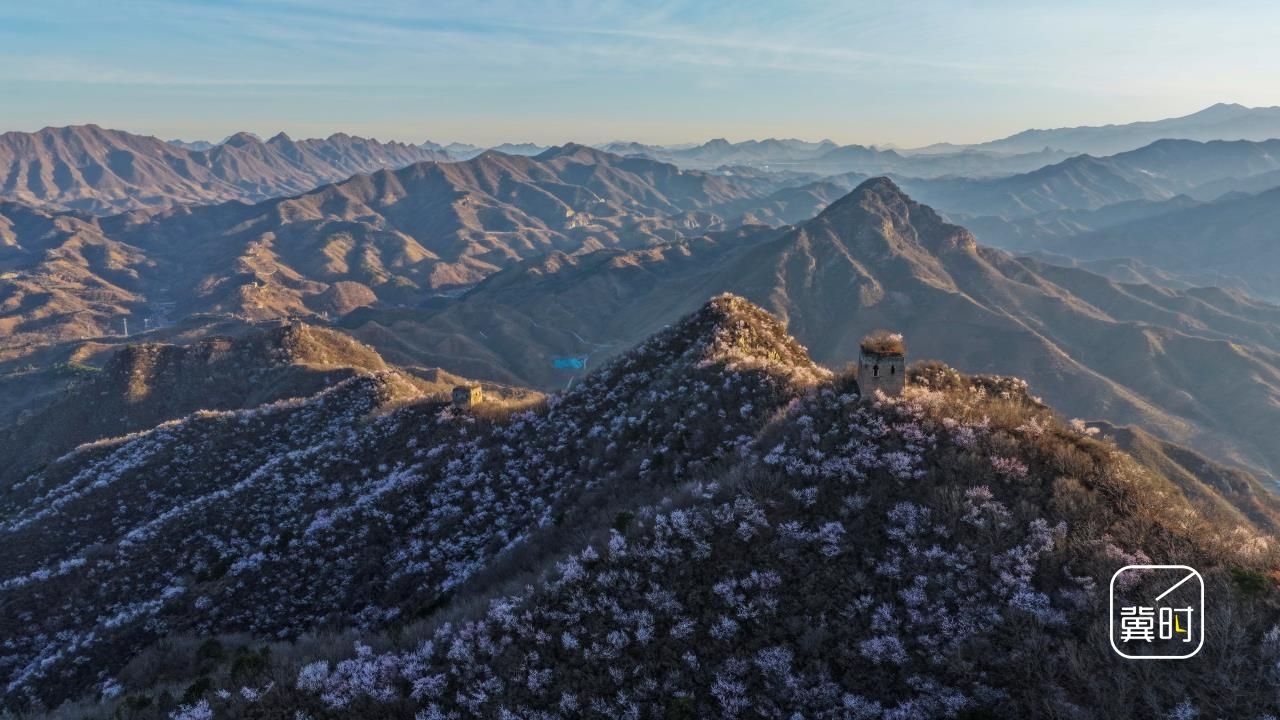 冀时新闻报道(通讯员 刘满仓)今天(3月30日)清晨,雨过天晴。唐山市迁西县金厂峪镇的榆木岭长城沐浴在晨光中,远山、朝霞、山花映衬的古长城宏伟壮观,美如画卷。