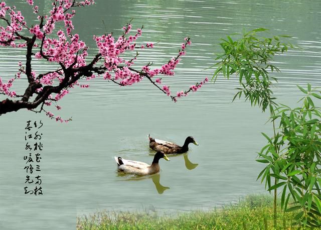 隔着疏落的翠竹望去,几枝桃花摇曳生姿。桃竹相衬,红绿掩映,鸭子在水中嬉戏,春意格外惹人喜爱。仿佛一幅生机盎然的工笔画,所谓“诗中有画,画中有诗”,不外如是。那满地蒌蒿、短短的芦芽,黄绿相间、艳丽迷人河豚也在回暖之际向上游回归。细细品读,一时之间,竟难辨是诗是画。
