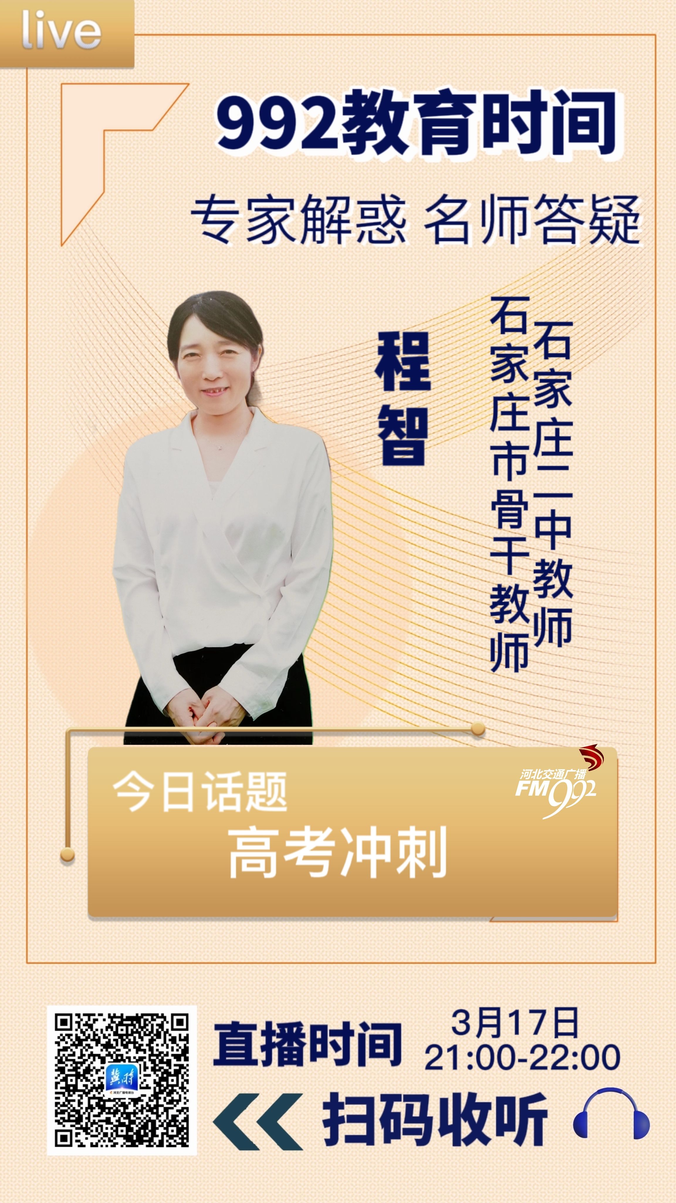 高考作为我们学业生涯中最重要的一场考试,学生和家长都会拼尽全力,背水一战。距离高考还有70多天,如何在最后这段时间里调整好状态,全面系统的复习,是很多同学最为关注的。《992教育时间》栏目特别邀请到石家庄二中教师、石家庄市骨干教师程智老师做客节目,就“高考冲刺”这个话题跟大家聊一聊,有哪些需要我们学生和家长应该提前关注。