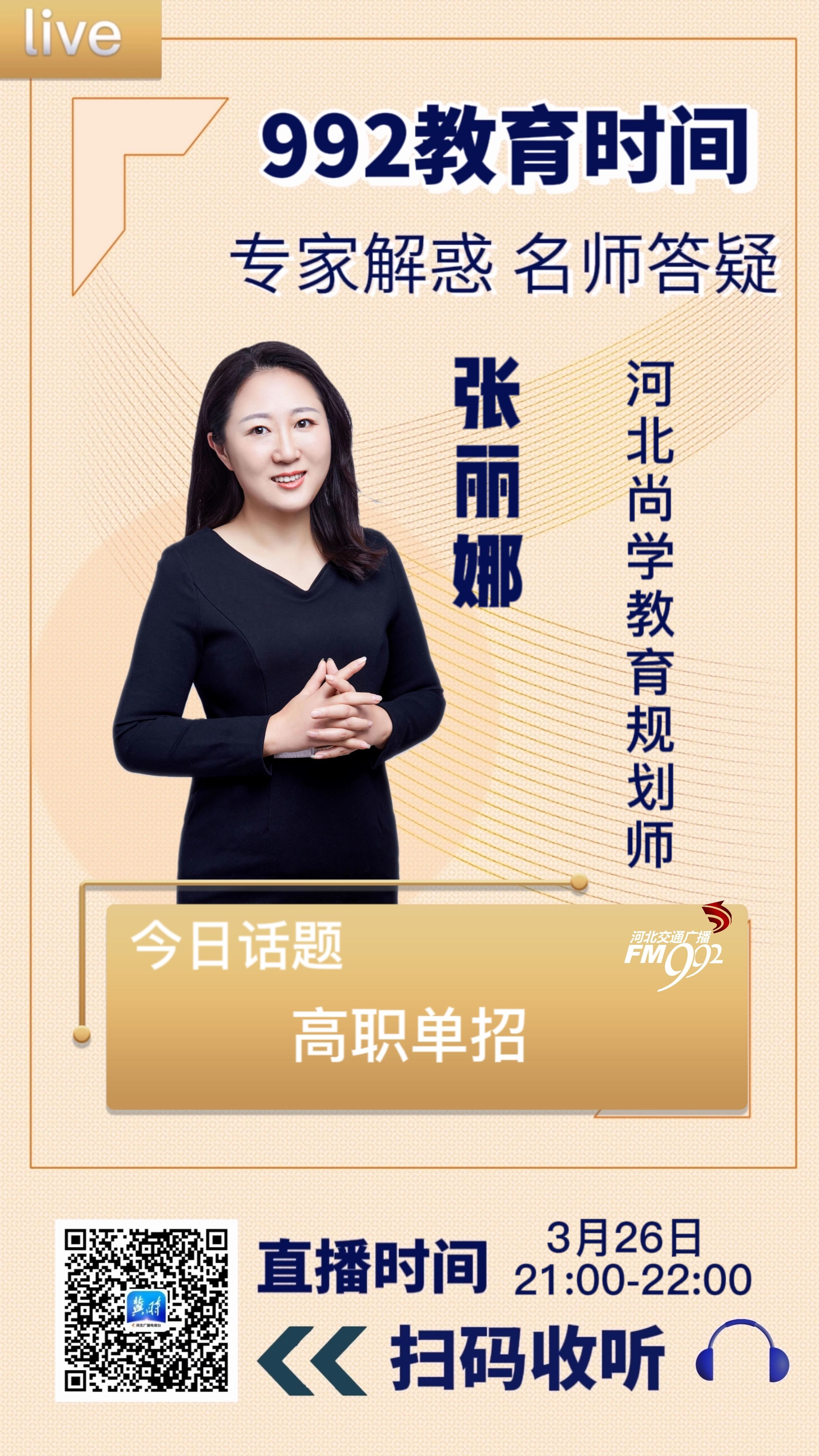高考从三月份起,每个月都有学生和家长关注的重要事件和节点。如果错过了,可能我们的孩子就错过了一条升学之路。那么从3月份起有哪些升学的关键事件呢?今天我们的992教育时间栏目,特别邀请到河北尚学教育规划师 张丽娜老师做客节目,就“高职单招”这个话题跟大家聊一聊,有哪些需要我们学生和家长应该提前关注。如果您有相关的问题,也欢迎大家随时发送到河北交通广播的微信中,我们随时为您解答。