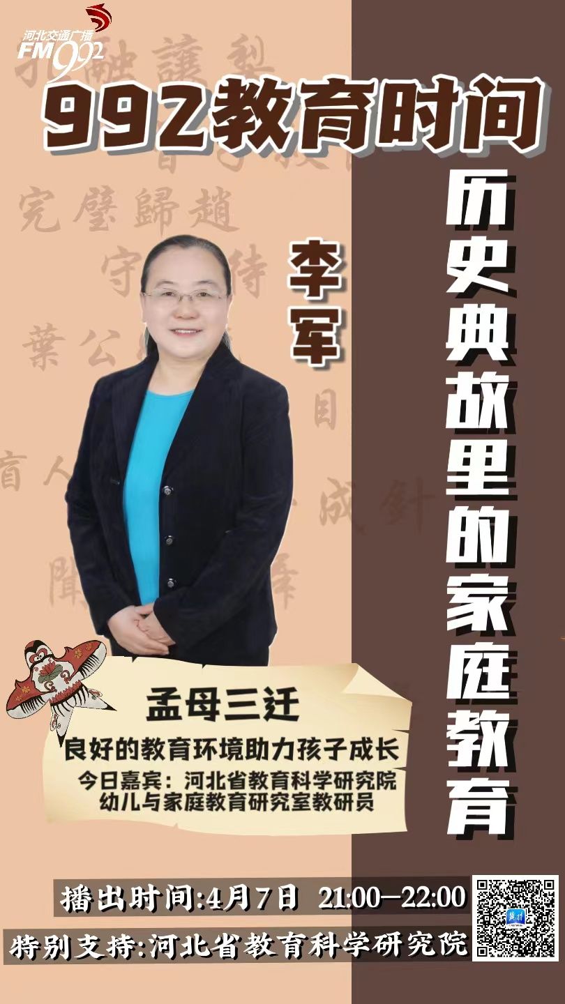 家庭教育在孩子的成长过程中,至关重要。如何让我们的孩子健康快乐的成长,就需要我们的家长掌握丰富的教育知识。纵观中华传统文化的历史长河,无数成语典故流传至今,我们细细翻阅品读,就会发现其中蕴含的家庭教育理念延续到今天依旧适用,其中的哲思令人受益匪浅。《992教育时间》特别推出“解读历史典故里的家庭教育”系列节目,通过一篇篇千古流传的佳作名篇,跟大家分享家庭教育的相关知识。“历史典故里的家庭教育”第一期——孟母三迁:良好的教育环境助力孩子成长,我们特别邀请到河北省教育科学研究院幼儿与家庭教育研究室教研员 李军老师做客节目,跟大家一起分享家庭教育的相关知识。