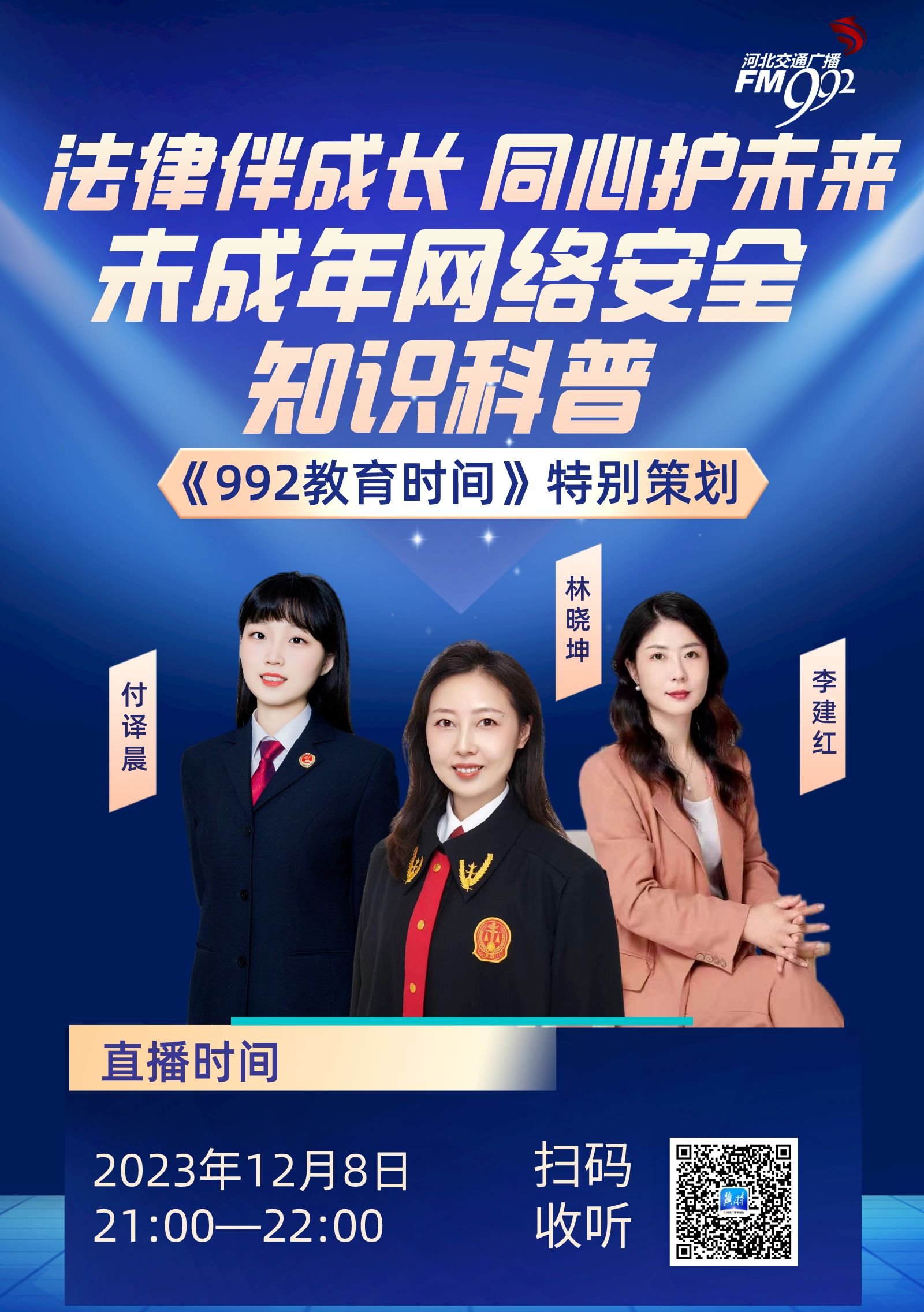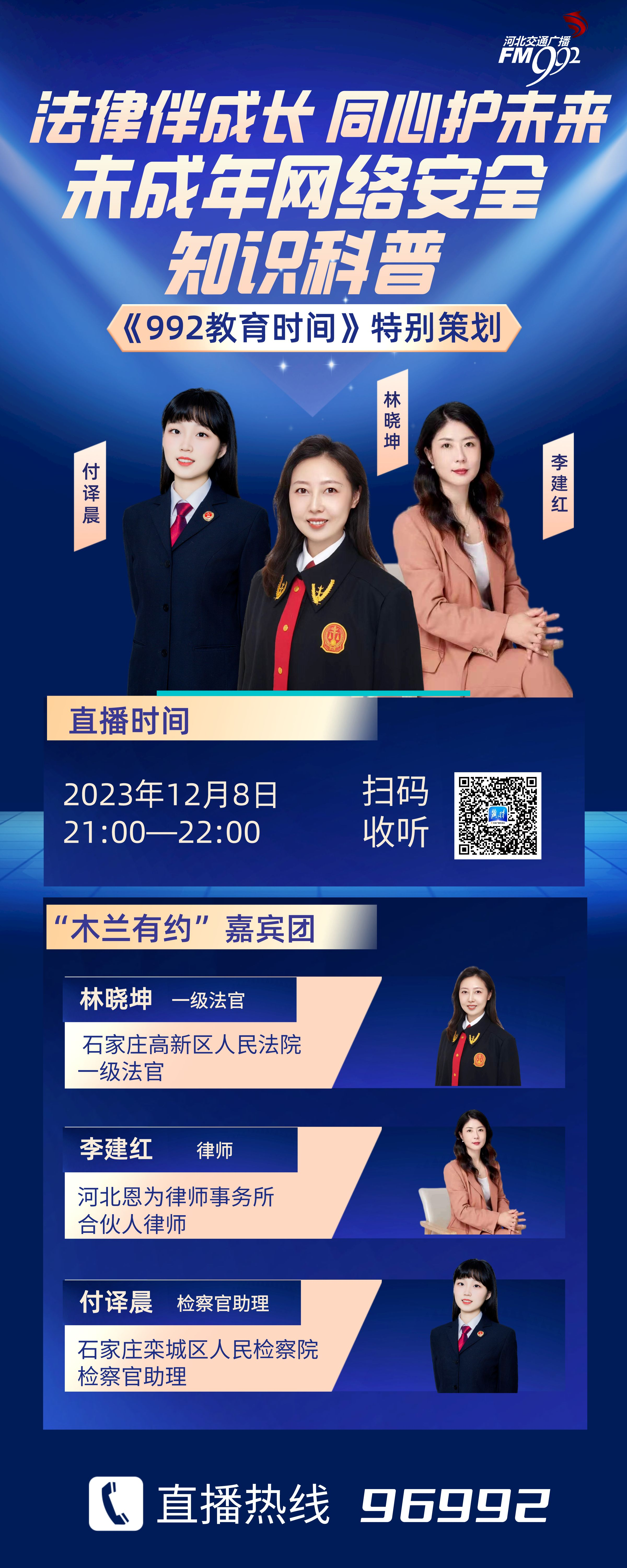 现代社会网络无孔不入,网络安全问题日益受到关注,青少年能够正确、合理利用网络日益变得重要。青少年沉迷网络会有哪些危害?孩子游戏充钱怎么办?孩子沉迷网络直播打赏钱能要回来么?未成年人如何预防网络炸骗等等家长关心的热门话题,我们特别为您邀请到石家庄高新区人民法院一级法官林晓坤、河北恩为律师事务所合伙人律师李建红、石家庄栾城区人民检察院检察官助理付译晨三位公检法相关工作人员做客节目,为广大学生和家长答疑解惑。