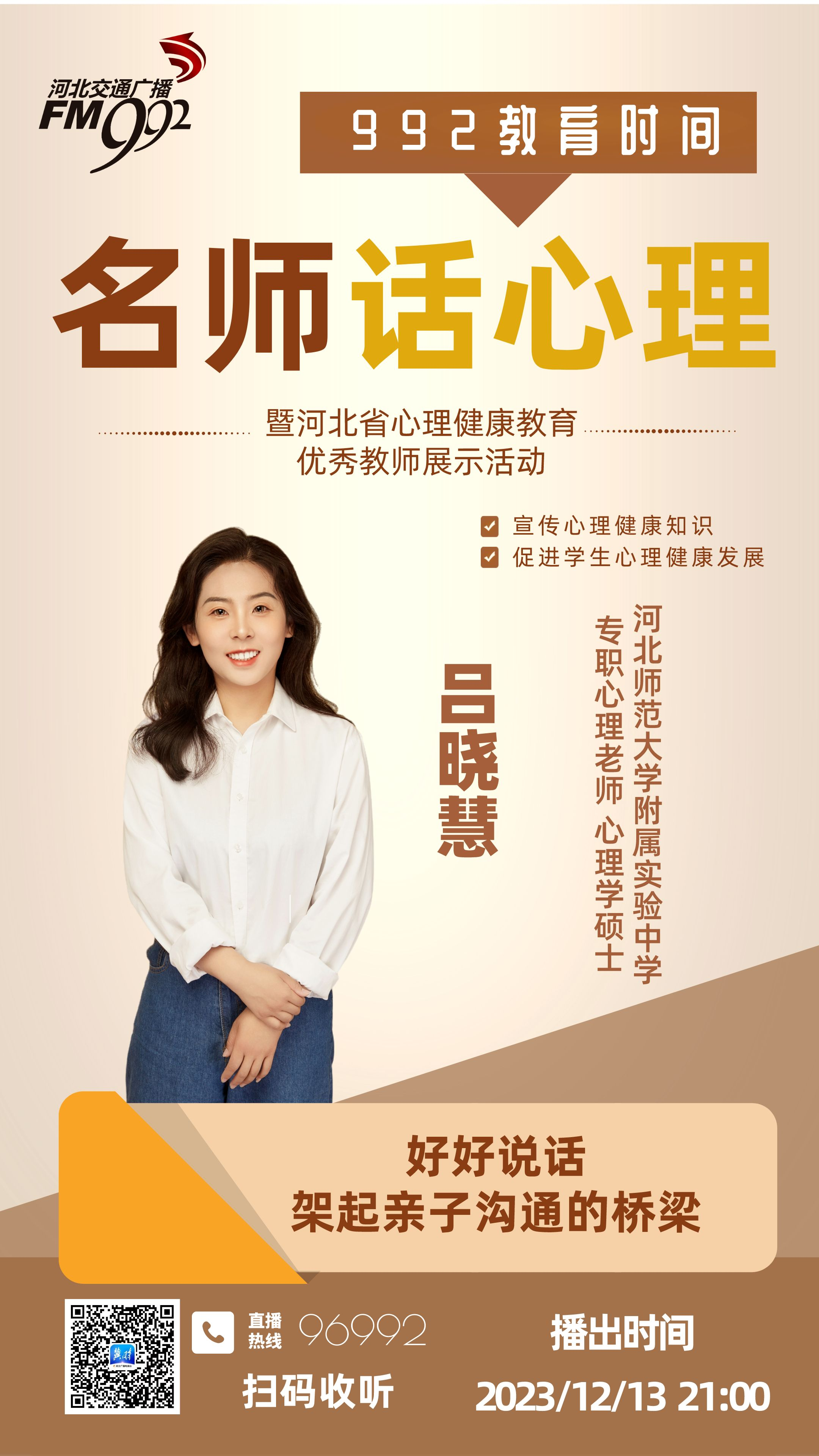 第一期节目,我们为您特别邀请到河北师范大学附属实验中学专职心理老师、心理学硕士吕晓慧老师跟广大家长朋友聊一聊亲子沟通这个话题,父母如何好好说话,架起亲子沟通的桥梁。我们的节目正在通过河北广播电视台冀时客户端、河北交通广播官方微信视频号、抖音等平台同步视频直播。欢迎您通过各种渠道收听收看。