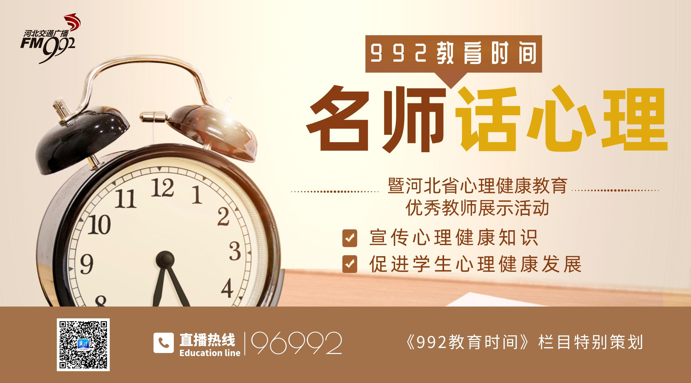 为了更好的将优质教师的心理健康教育理念和经验分享给更多的家长和学生,河北广播电视台河北交通广播《992教育时间》栏目同河北省教育科学研究院特别策划了“名师话心理”系列节目,节目特别邀请河北省心理健康教育优秀教师评选活动中获奖的12位优秀老师,以常见的中小学常见学生心理问题跟大家分享,每一期一个主题,帮助学生和家长解答心理健康方面的问题和困惑,宣传心理健康知识,促进学生心理健康方面的发展。
