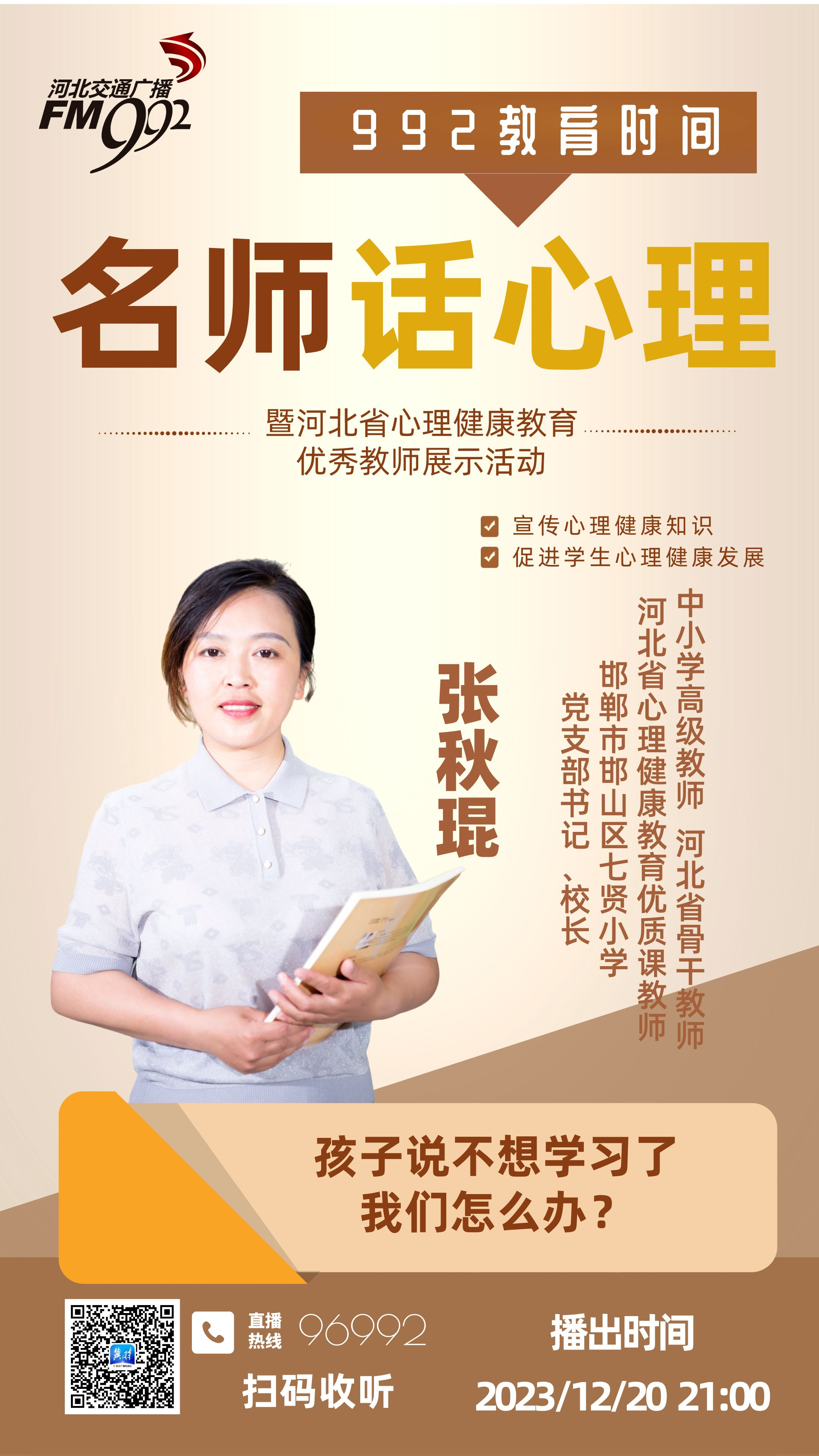 第二期节目,我们为您特别邀请到邯郸市邯山区七贤小学党支部书记,校长。中小学高级教师,河北省骨干教师,河北省心理健康教育优质课教师张秋琨校长跟广大家长朋友聊一聊学习动力这个话题,当孩子说不想学了,我们该怎么办?