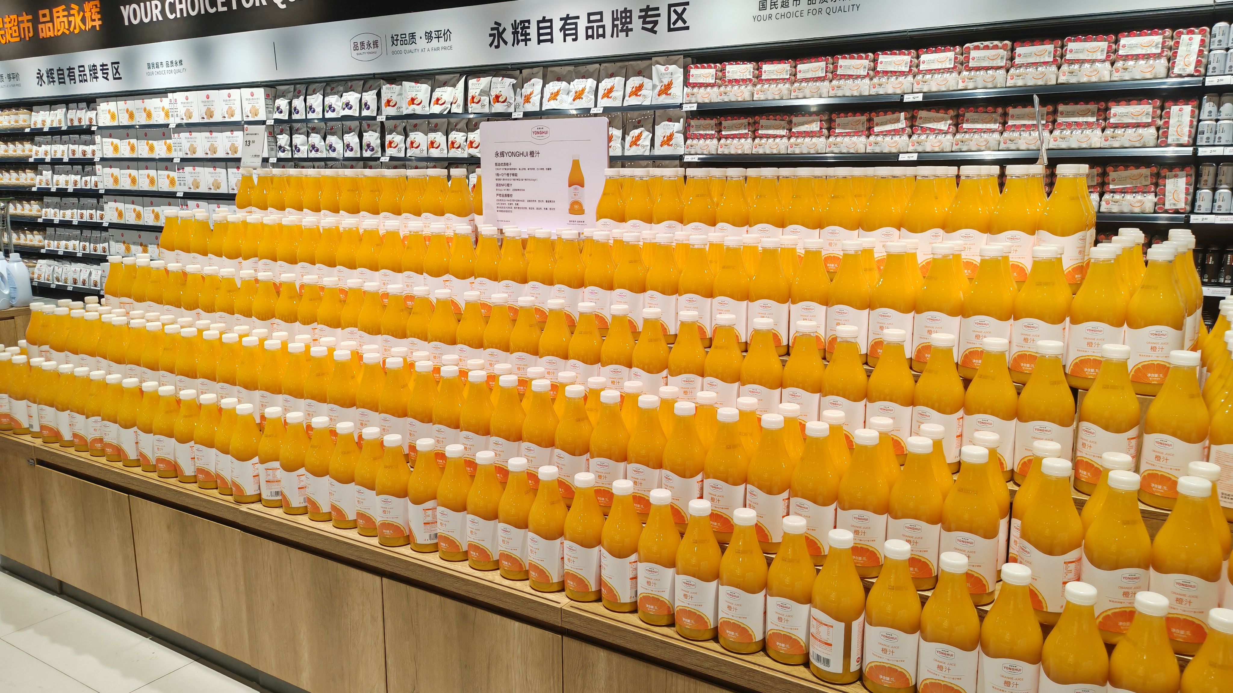 值得关注的是,门店设立了胖东来自有品牌专区和永辉自有品牌专区。胖东来专区引入了DL100%橙汁、DL精酿小麦啤酒、DL宝丰自由爱白酒、DL水果燕麦脆、DL小磨芝麻香油等爆款商品。