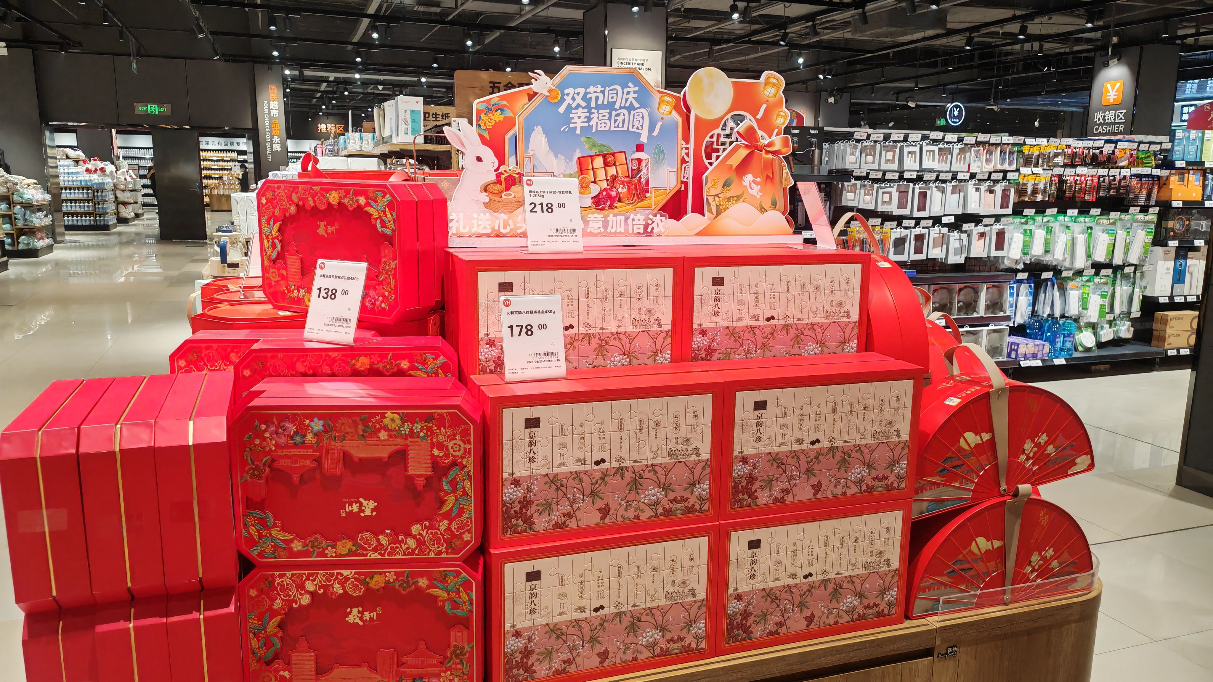 双节期间,门店还推出了一系列特色服务:9月3日至10月8日期间,为玩具、小家电、月饼礼盒等有规则外包装盒的商品提供免费礼品包装服务;日常营业时间提供免费寄存服务,超出自助柜尺寸的物品可由服务台登记寄存;同时提供帮寄服务,顾客购物后可将物品寄存门店代发;假期期间,门店还将开放临时休息处,配备沙发、椅子与茶歇,方便旅游出行的消费者歇脚充电。
