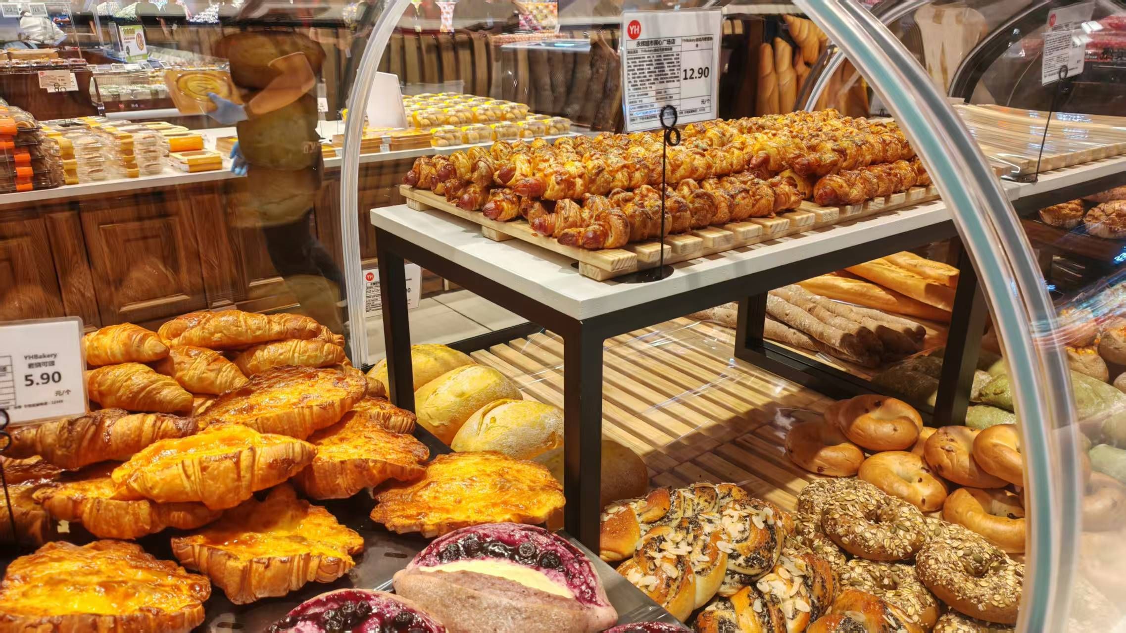 烘焙区是本次调改的一大亮点。YH中秋大月饼、意式丹麦香肠卷、碱水面包、巧克力巴布卡、羽衣甘蓝芝士香肠恰巴塔、金瓜枸杞软欧包等特色产品琳琅满目。