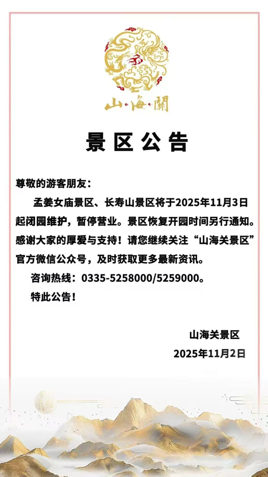 山海关景区最新消息,今天起,孟姜女庙景区、长寿山景区闭园维护,暂停营业。
