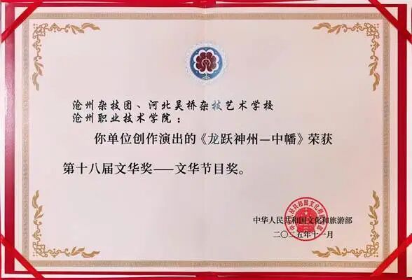 《龙跃神州——中幡》由沧州杂技团、河北吴桥杂技艺术学校、沧州职业技术学院联合打造,该节目聚焦传承弘扬中华优秀传统文化,在表演形式上突破了传统模式,以“文活武演”的表现形式拓展了杂技艺术的新表达,将京剧韵白与身段、古典舞韵律、武术动作巧妙融入表演,同时大幅升级翻、转、腾、传、顶等高难度技巧,呈现出刚柔并济、惊险与美感兼具的独特艺术效果,对于弘扬中华民族精神、宣传展示中华优秀传统文化具有积极作用。该节目已斩获中国杂技金菊奖、中国吴桥国际杂技艺术节金狮奖等国内外重要奖项,并于2023年登上央视春晚舞台。此次亮相中国艺术节并荣获文华奖,再次向外界展示了沧州杂技的独特魅力和深厚实力!