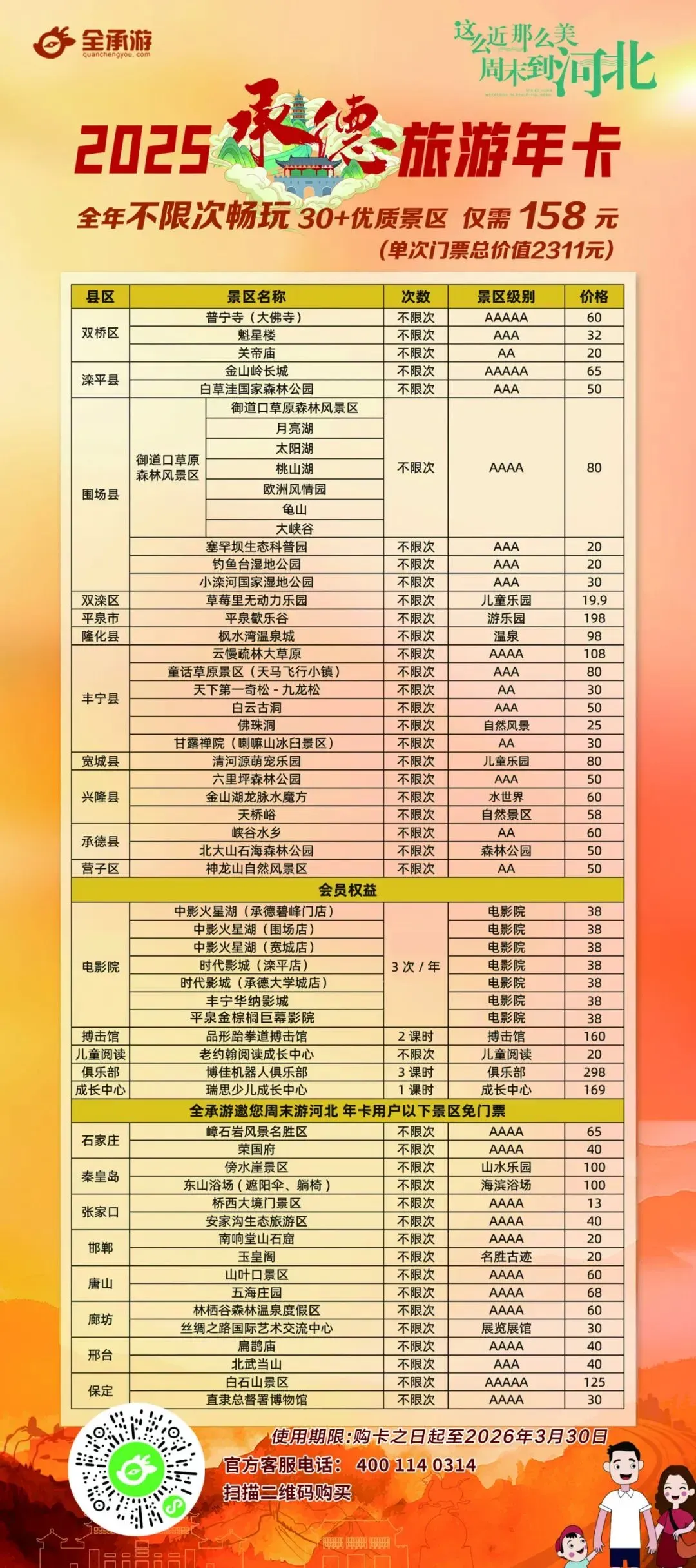 3.“全承游”承德旅游年卡中包含的景区会因淡旺季进行临时性调整,一切以线上更新景区为准,最终解释权归活动赞助商所有。