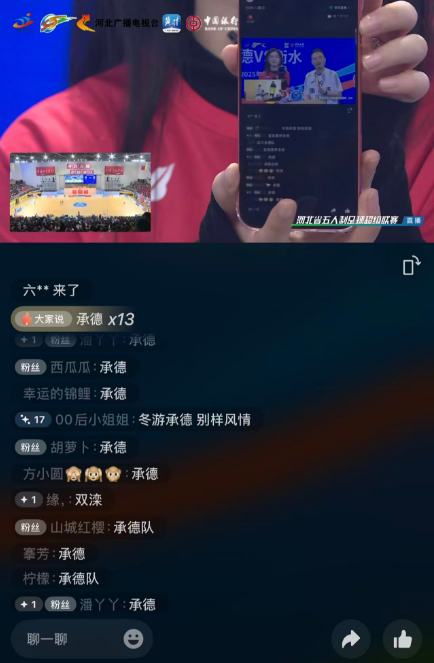 互动直播间内悠悠、皓程组成的快乐主播团默契十足,他们携手承德鸿泰总公司的靳敏娜,全程互动送奖让云端观赛充满趣味。每一轮互动都掀起评论区热潮,“想要福利”“衡水加油”“承德必胜”“为五超加油”……的留言不断刷屏。