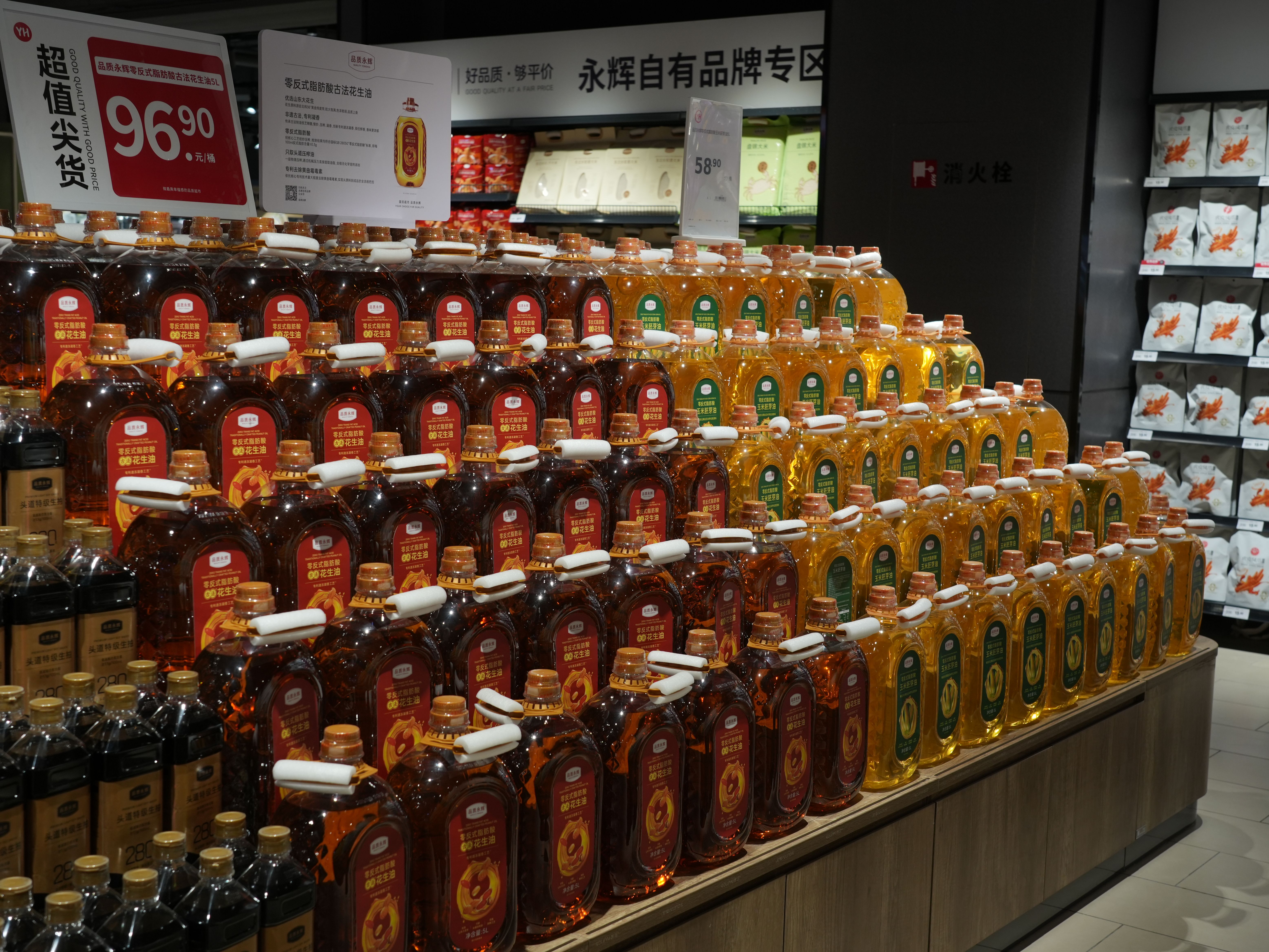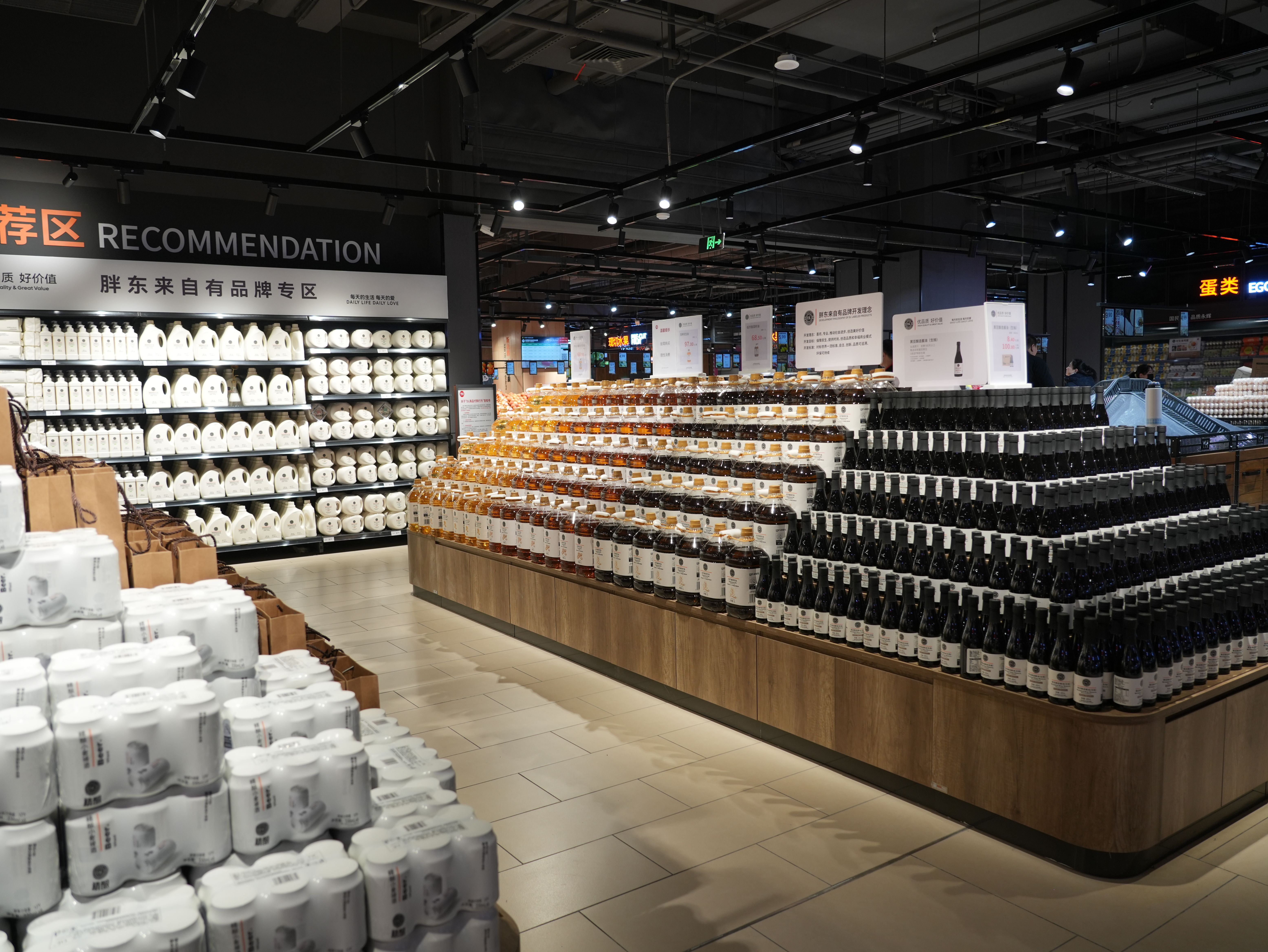 最引人注目的是设立的胖东来自有品牌专区。DL果蔬餐具净、DL饮用天然矿泉水、DL100%葡萄复合果汁、DL精酿小麦啤酒、DL宝丰自由爱白酒等几十款网红商品集中亮相,所有商品均与河南许昌胖东来门店保持同源、同质、同价。同时,永辉自身的商品体系也同步升级强化。“品质永辉”作为永辉自有品牌,重点推出了历经439道安全关卡的橙汁、微胶囊香氛酵素洗衣液、头道特级生抽、东北长粒香大米等高频家庭单品,以“好品质、够平价”赢得信赖。“永辉定制”则代表与伊利等一线品牌的联合定制成果,如严于欧盟标准的定制鲜牛奶、源自挪威核心产区E+级品质的三文鱼等,实现了“大牌品质、亲民价格”。