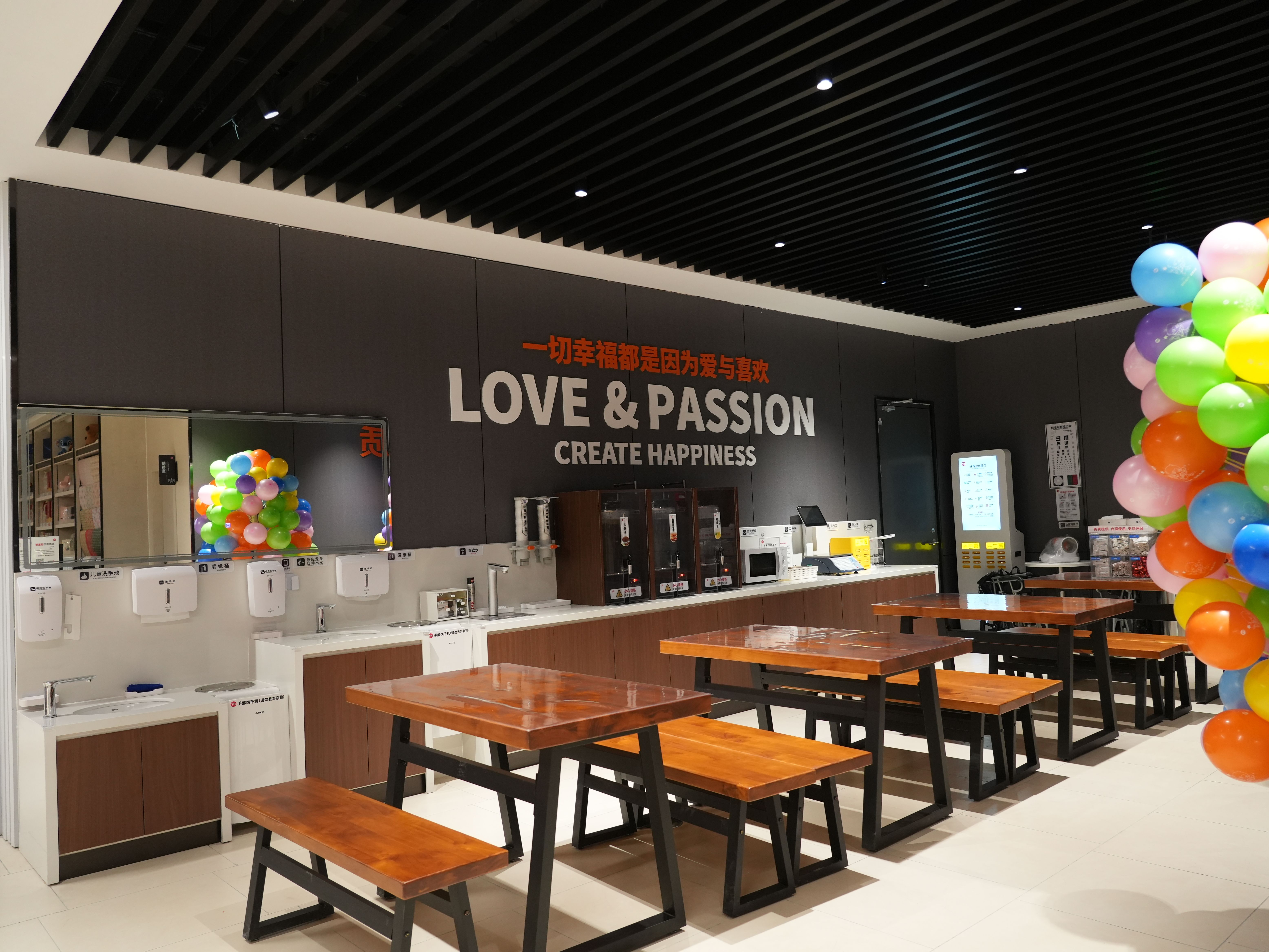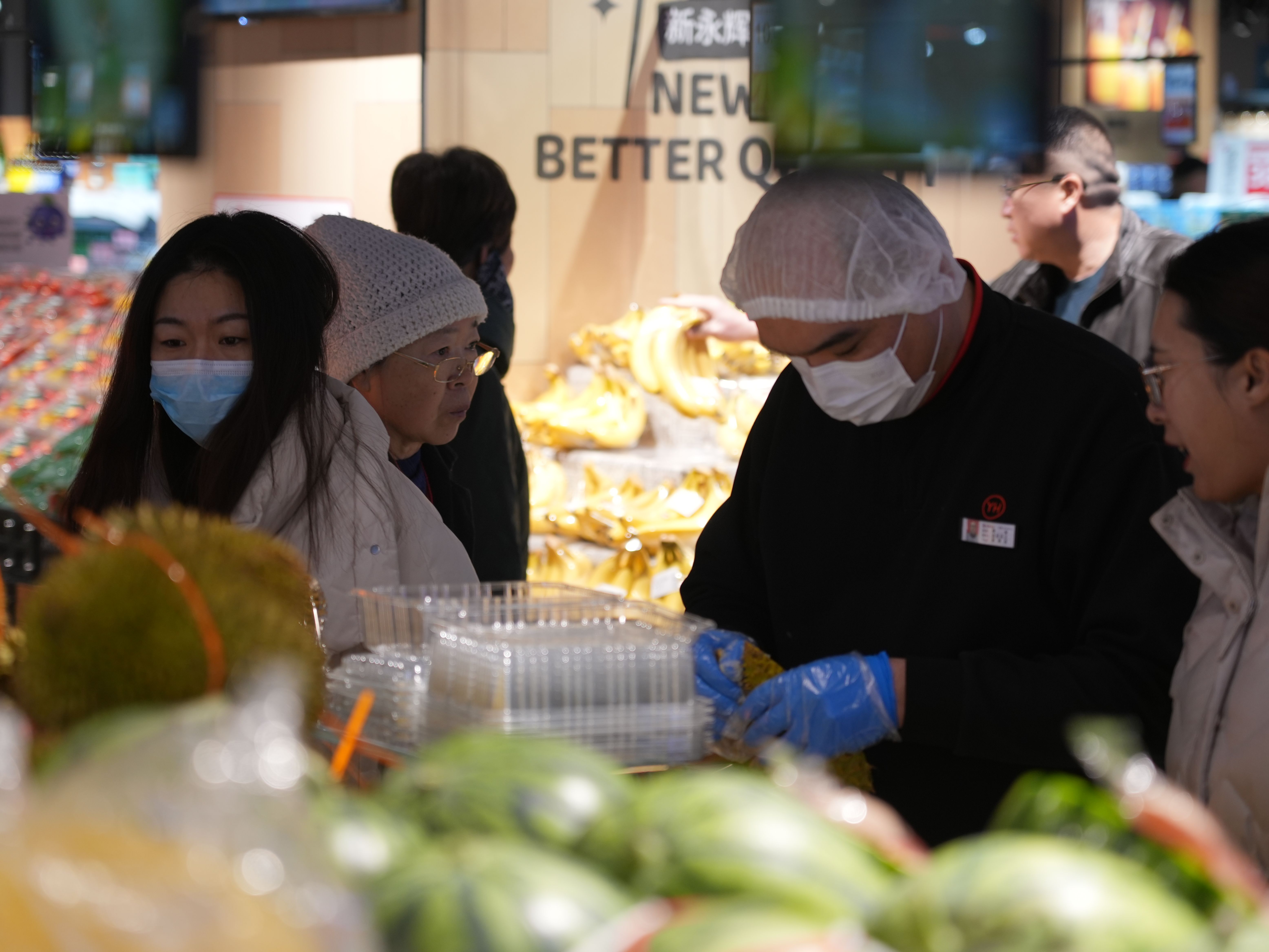 服务的温度藏在每一个细节里。食品货架旁摆放着老花镜和放大镜;连卷袋处贴心设置了湿手器;冷链区域为顾客准备了防冻手套;购买整个西瓜、榴莲、椰青等,可享免费现切、剥壳服务;肉禽柜台支持免费切丝、切片、绞肉、剔骨;海鲜区可提供宰杀、清洗、打氧服务,甚至未来还将上线免费代蒸服务。便民服务区宛若一个“社区生活服务站”:配备了身高体重测量仪、血压仪、温水洗手池、直饮水机、微波炉、免费茶饮、前一小时免费充电宝,更特别增设了宠物安置区和配有桌椅的顾客休息区,方便“边吃边逛”。