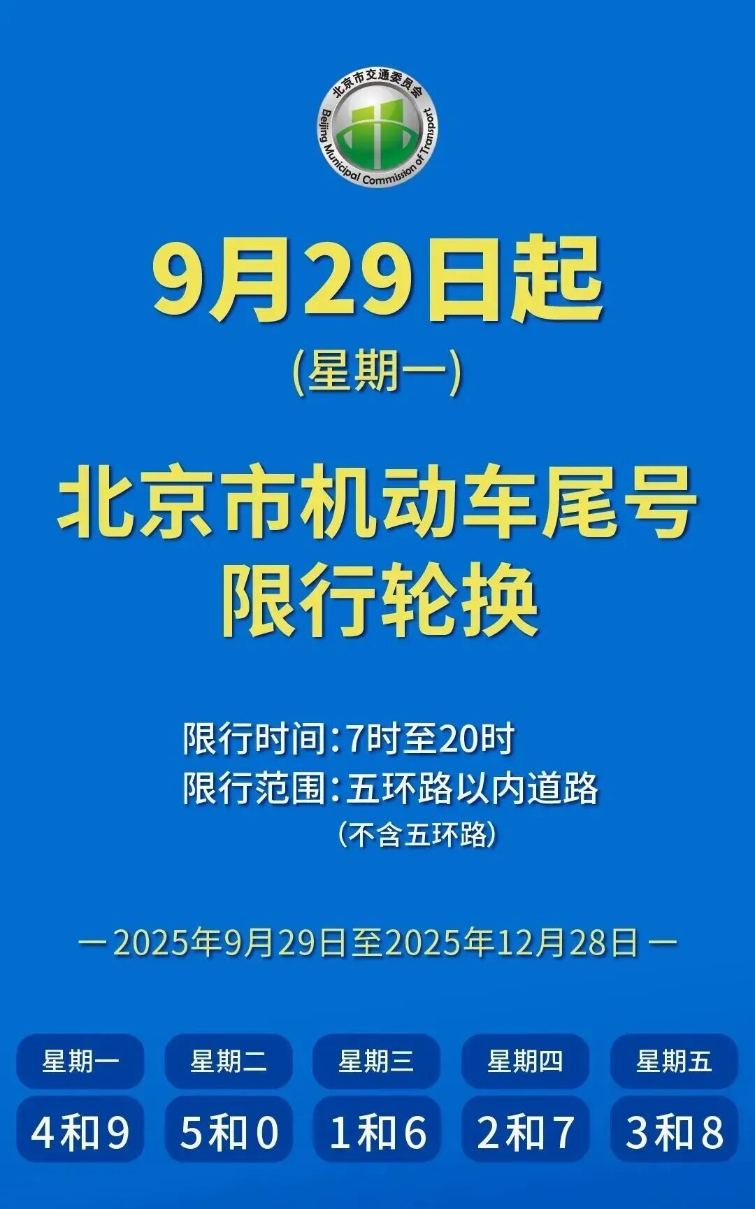 2025年9月29日至2025年12月28日,星期一至星期五限行机动车车牌尾号分别为:4和9、5和0、1和6、2和7、3和8(机动车车牌尾号为英文字母的按0号管理)。