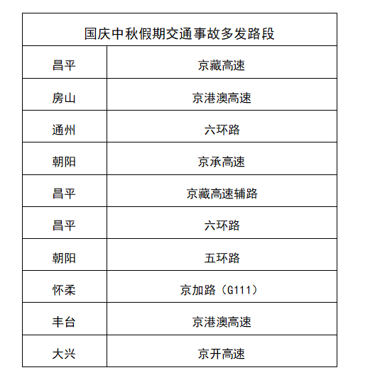 结合近五年数据,北京交管部门公布国庆中秋假期交通事故多发路段: