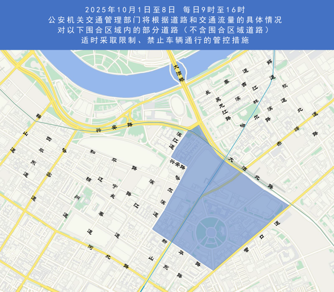 (一)10月1日至8日每日9时至16时,大沽北路、营口道、新华路、哈尔滨道、兴安路、滨江道围合区域部分道路(不含上述围合道路),适时采取限制、禁止车辆通行的管控措施时,车辆可经山西路、多伦道、荣业大街等道路绕行。