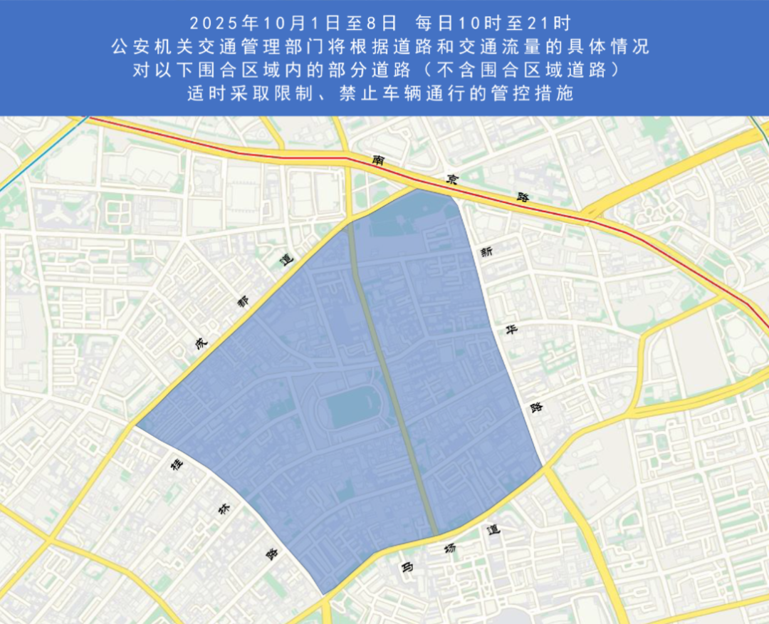 二、2025年10月1日至8日,每日10时至21时,公安机关交通管理部门将根据道路和交通流量具体情况,对成都道、南京路、新华路、马场道、桂林路围合区域部分道路(不含上述围合道路),适时采取限制、禁止车辆通行的管控措施。