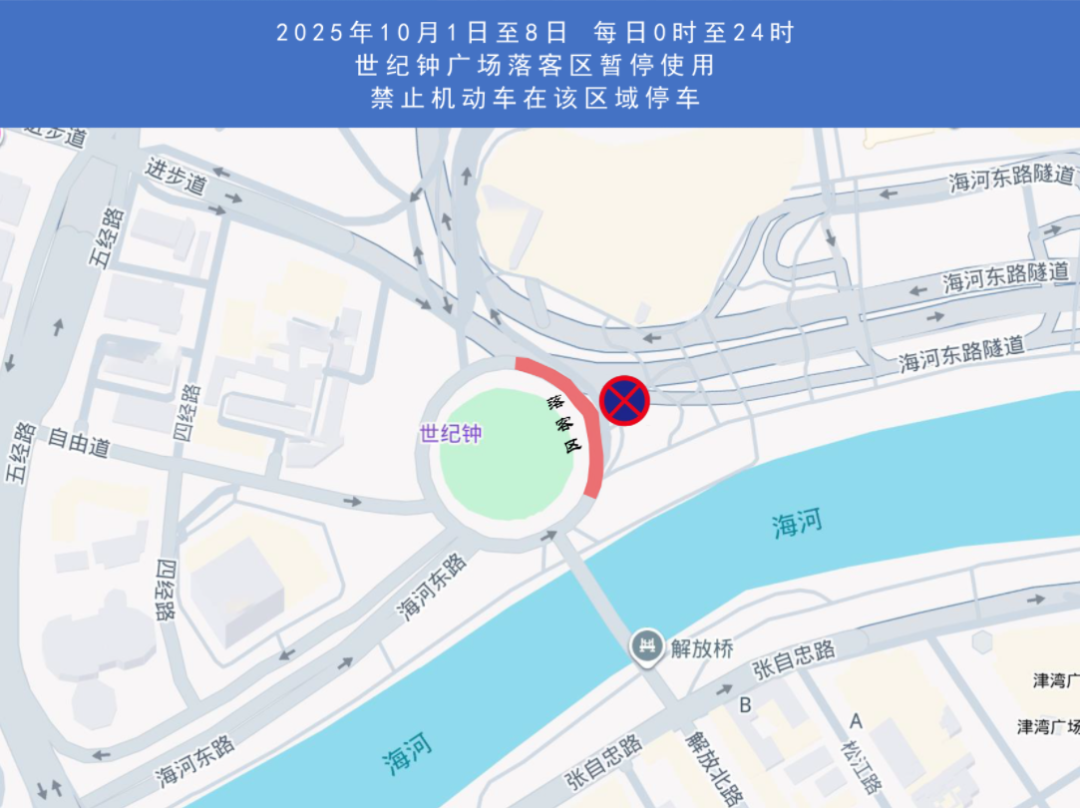 (四)10月1日至8日世纪钟广场落客区暂停使用,禁止机动车在该区域停车,赴天津站送乘客车辆可由海河东路隧道落客区和天津站后广场华兴道地下隧道落客区送乘客。