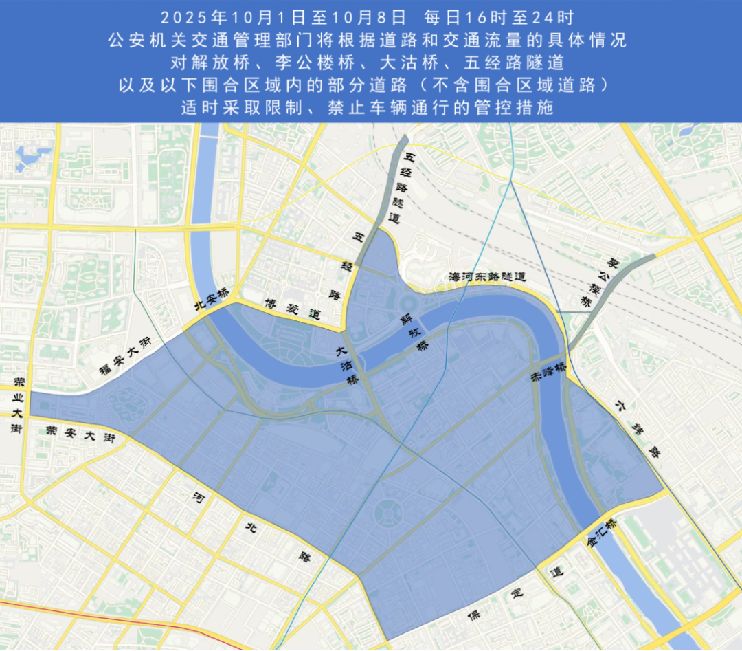 三、2025年10月1日至8日,每日16时至24时,公安机关交通管理部门将根据道路和交通流量具体情况,对解放桥、李公楼桥、大沽桥、五经路隧道等桥梁隧道,以及保定道、金汇桥、六纬路、海河东路隧道、五经路、博爱道、北安桥、福安大街、荣业大街、荣安大街、河北路围合区域部分道路(不含上述围合道路),适时采取限制、禁止车辆通行的管控措施。