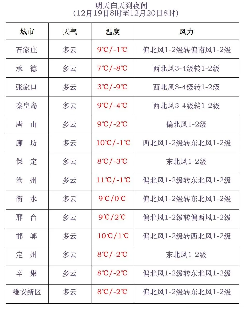 今天下午到夜间,张家口北部、承德北部多云转阴有小雪或零星小雪,其他地区晴转多云。今天下午,张家口、承德西部、沧州东部、衡水、邢台东部、邯郸东部有偏南风4到5级,阵风6到7级。今天夜间,渤海海域和沿海地区有偏南风5到6级,阵风7到8级。