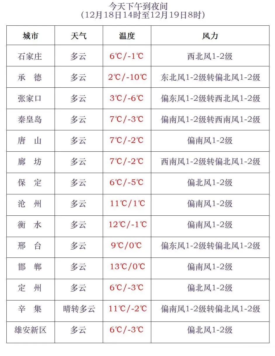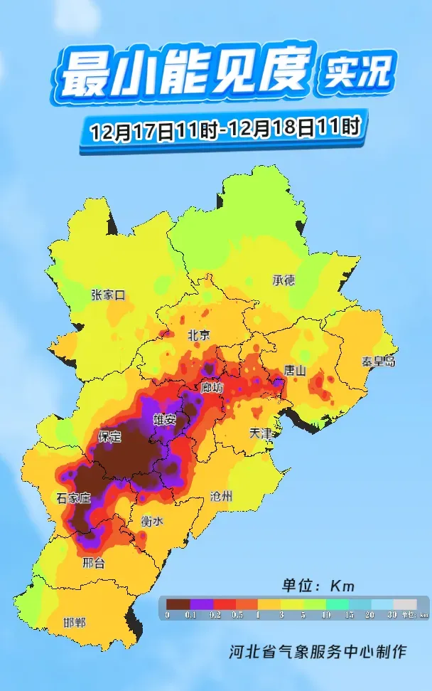 12月17日11时至18日11时,我省中部地区有雾,其中廊坊南部、雄安新区、保定东部、石家庄东部、沧州西部、衡水北部、邢台北部等地能见度小于200米,局地低于50米。