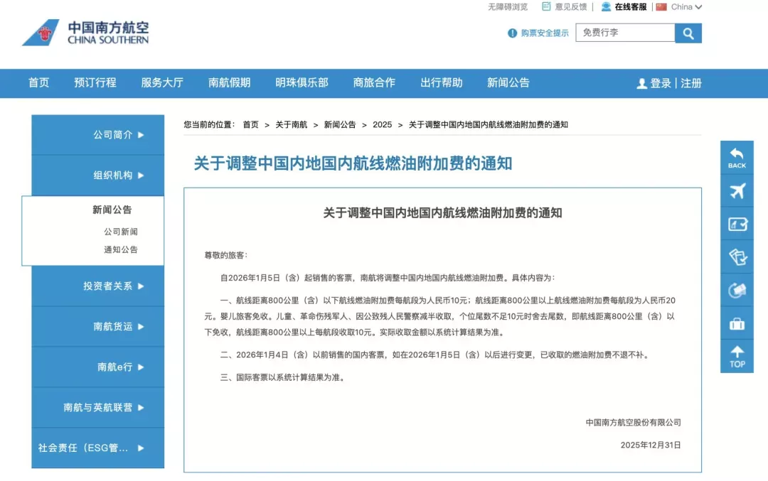 2025年12月31日,东方航空、南方航空和中国国际航空发布通知,自2026年1月5日(含)起销售的客票,调整国内航线旅客运输燃油附加费征收标准。