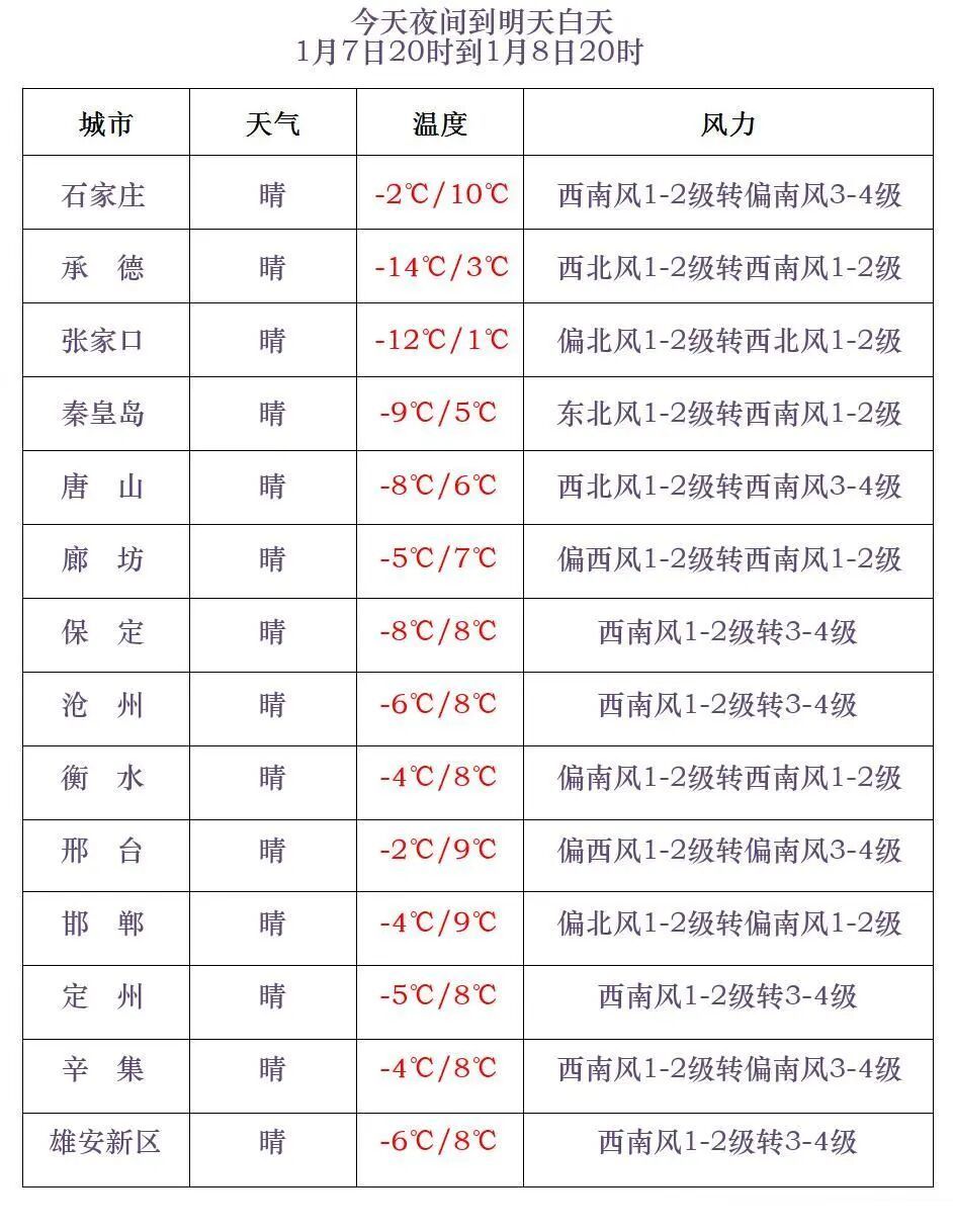 今天傍晚到夜间,石家庄、沧州及以南地区多云转晴,其他地区晴间多云。最低气温,张家口、承德、保定西北部、秦皇岛北部-25~-12℃,其他地区-11~-2℃。明天白天,全省晴间多云。最高气温,张家口北部、承德北部-5~0℃,其他地区1~10℃。