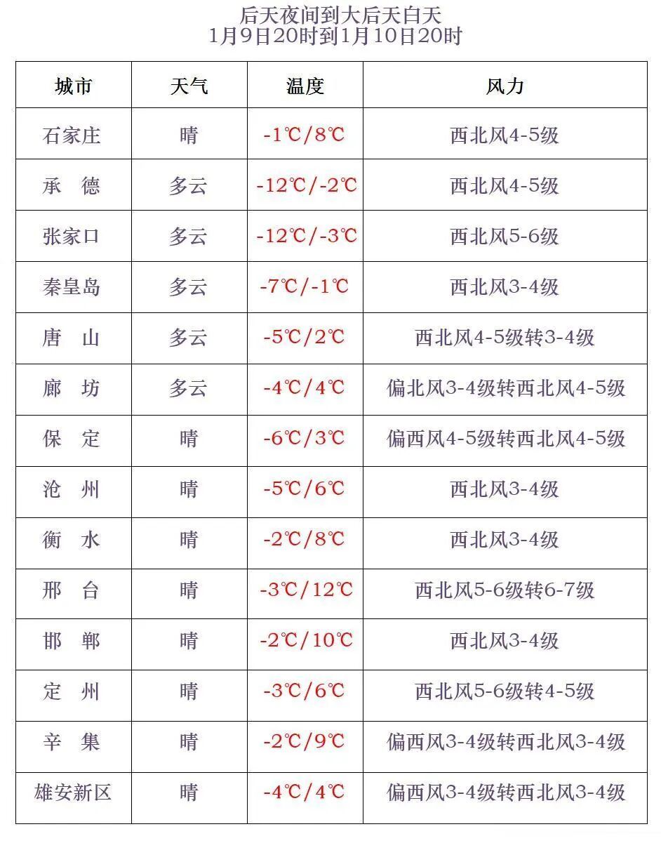 9日夜间至10日,北部地区多云,其中坝上地区阴有小雪或零星小雪,其他地区多云转晴。10日早晨,张家口、承德、保定西北部和石家庄西部最低气温下降5~7℃,其中坝上地区下降8~10℃。