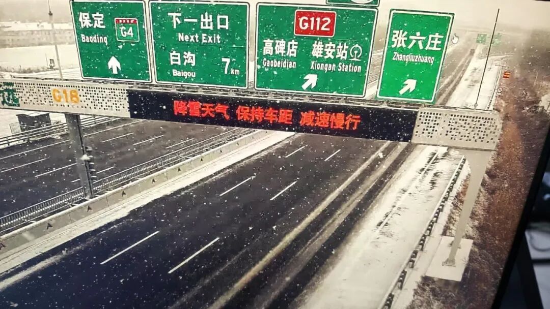 河北高速交警:今早7时许,霸州大队津雄高速降雪,双向撒布融雪剂,及时修改路面LED显示屏提示内容。