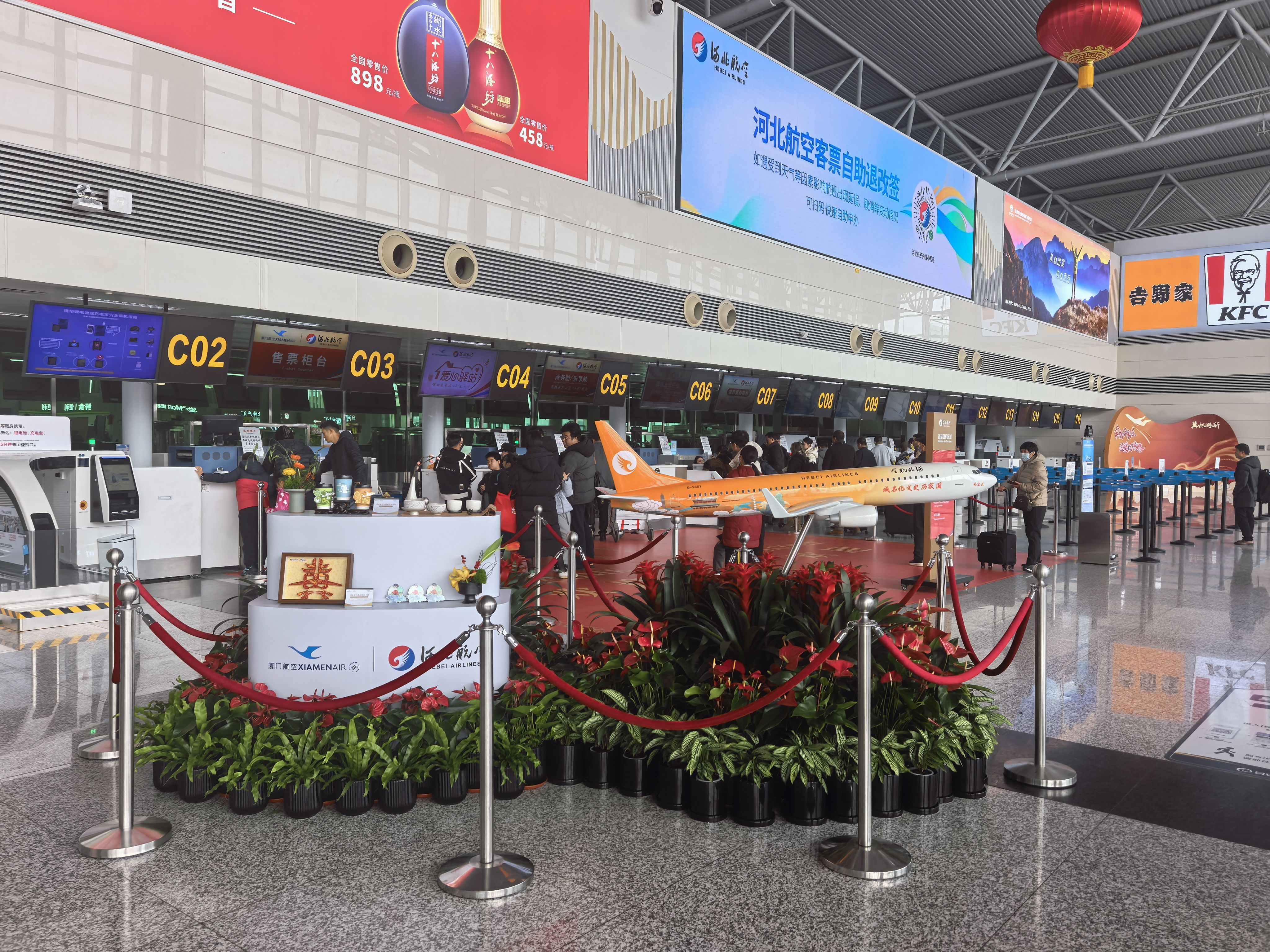 在石家庄机场C2值机岛,河北航空精心打造的燕赵特色展台引人注目,河北航空值机柜台张贴有河北11个地市特色地标的非遗剪纸图案,同时展示有蔚县剪纸、衡水内画、曲阳石雕、藁城宫灯等河北地方好物,将燕赵文化深度融入旅客春运出行保障的各个环节,营造有文化、有温度的候机环境,让旅客在旅途中邂逅浓郁的河北韵味与新春暖意。