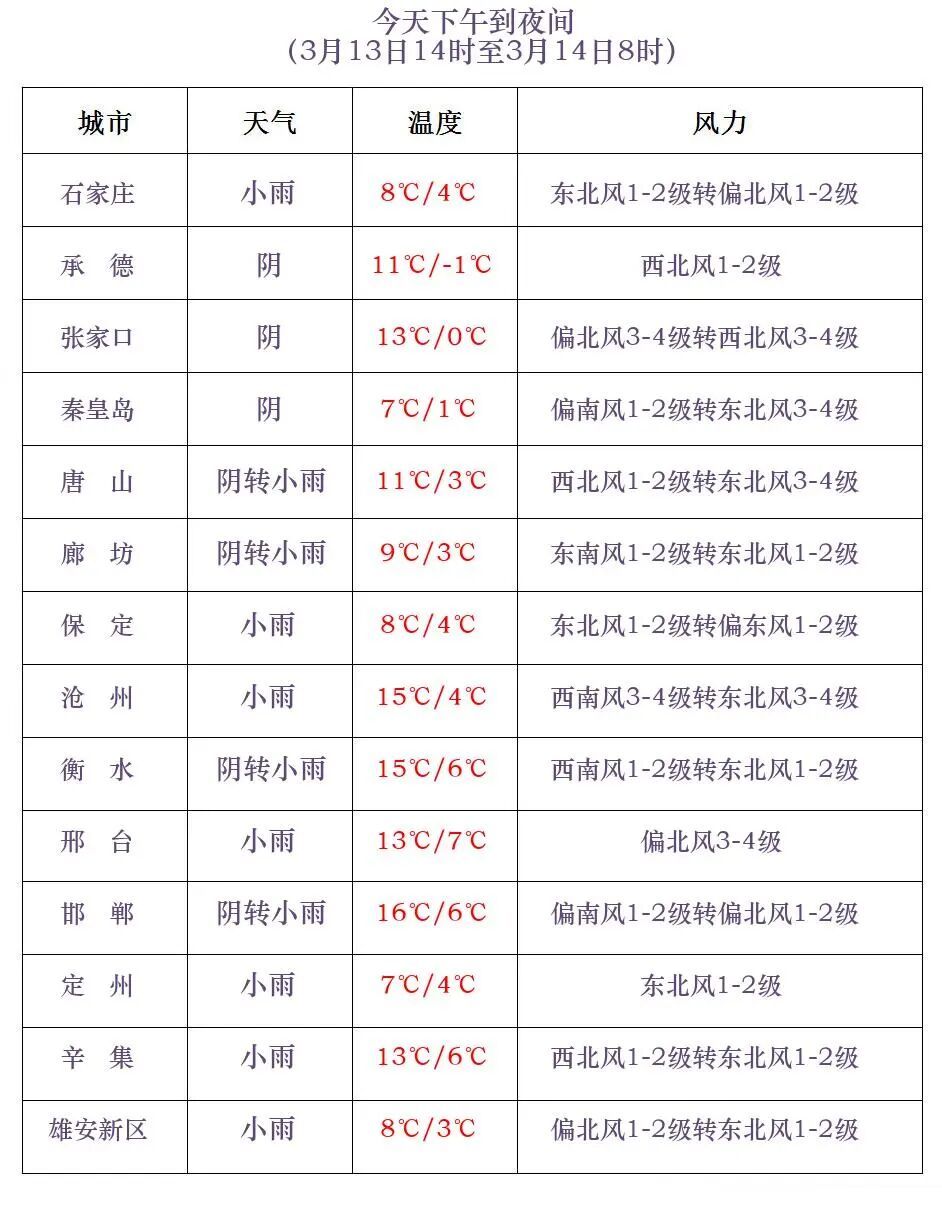 今天下午到夜间,全省阴,张家口南部和保定、石家庄、邢台、邯郸四个地区的西部山区有小雪或雨夹雪,唐山南部、秦皇岛南部、保定东部、雄安新区、廊坊南部、石家庄东部、沧州、衡水、邢台东部、邯郸东部有小雨或零星小雨。